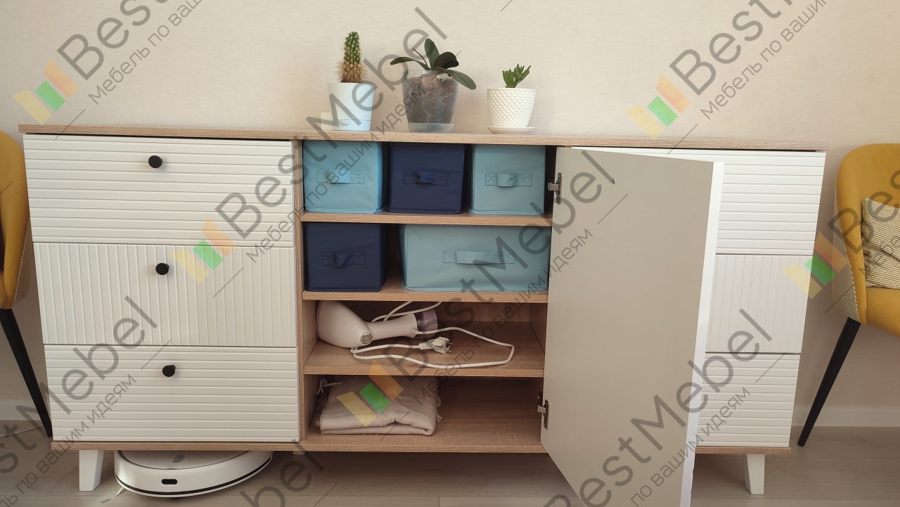 Комод очень понравился. Искали максимально длинный комод, во всю стену и чтобы подошел к интерьеру. Заменили одну полку в центральном отделении на три (добавили две дополнительные). Удобно, что у модели есть ножки и можно выбрать их высоту, чтобы прошел робот-пылесос. Сделан качественно, хорошие материалы, фрезировка фасадов выглядит отлично. Заказ 00000183333