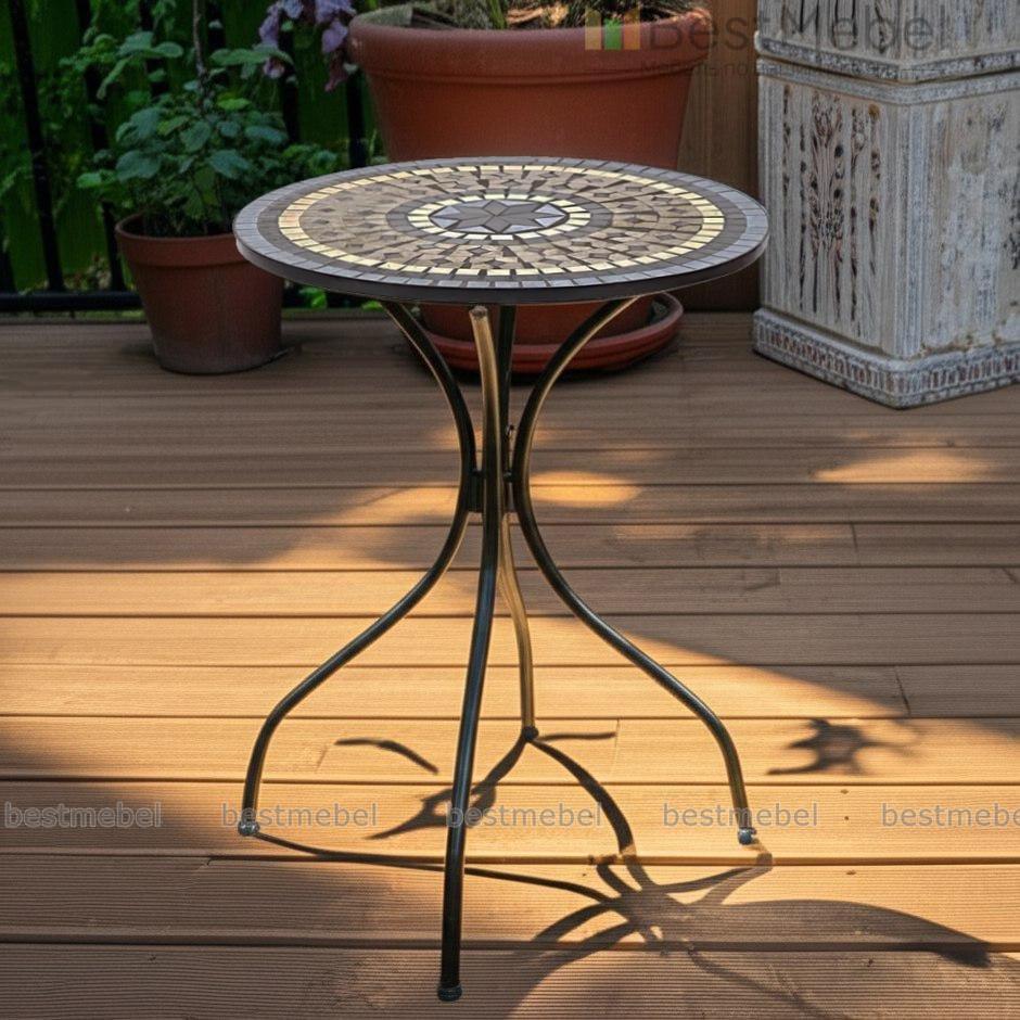 Стол Ромео вы сможете использовать как часть модульного комплекта или стильный акцент. Модель выполнена из высококачественного стального сплава, создавая прочную и визуально легкую конструкцию, которая не боится перепадов температур и солнечных лучей. Круглая столешница, декорированная оригинальным винтажным орнаментом из мозаики, поможет эффектно сервировать обед или разместить предметы декора. Купить стол Ромео для меблировки балкона, веранды или гостиной загородного дома вы сможете в нашем интернет-магазине.