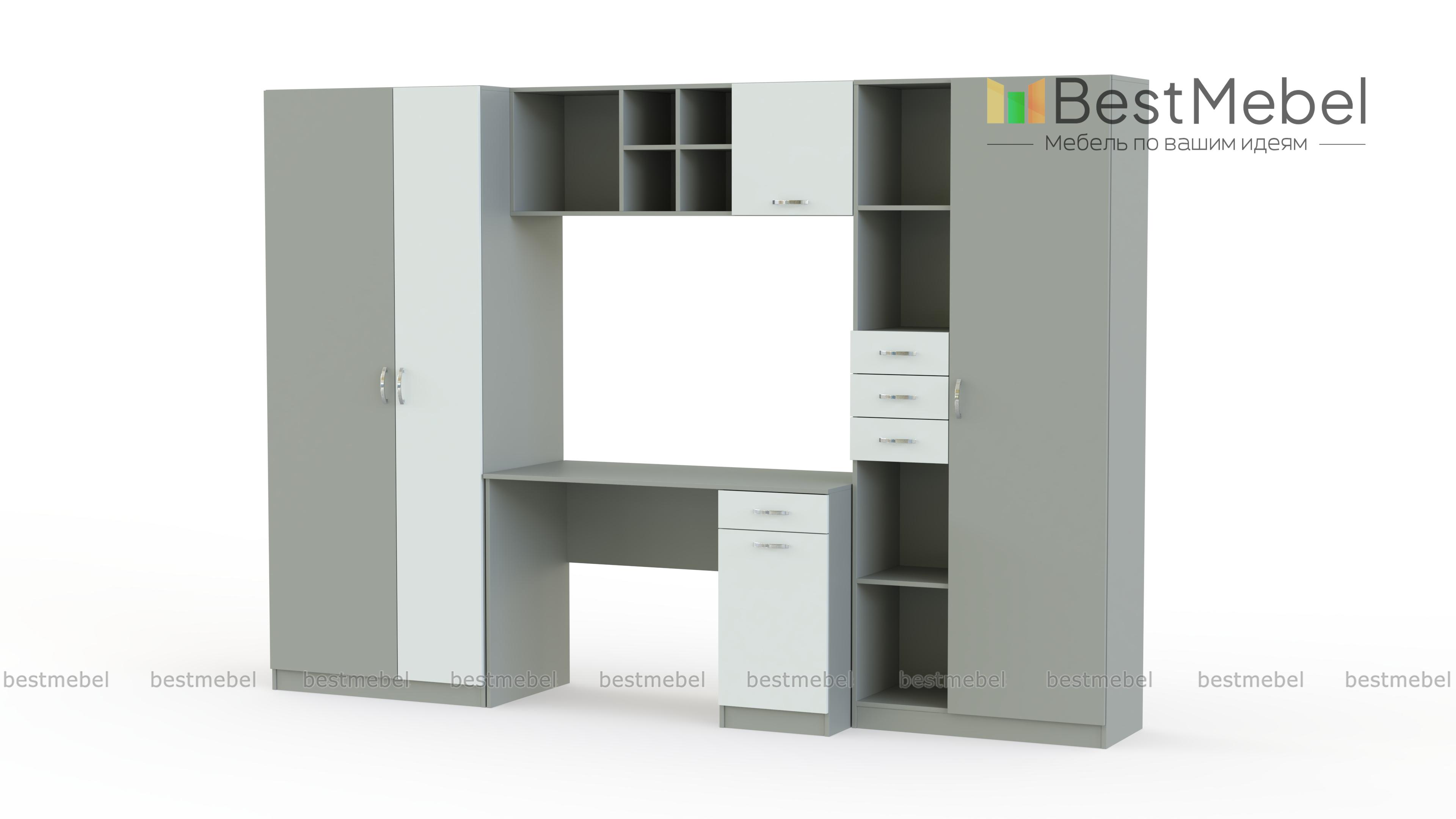 Вместительная и функциональная детская стенка Симба Композиция 1 BMS решит в комнате ребенка проблемы с размещением рабочего места и хранением самых разнообразных вещей. В комплект входят письменный стол с тумбой, комбинированный стеллаж, навесная полка и двухдверный одежный шкаф. Книги, игрушки, школьные принадлежности и предметы гардероба всегда будут в порядке и под рукой. Не оставит равнодушными детей и взрослых и яркая, контрастная расцветка фасадов.