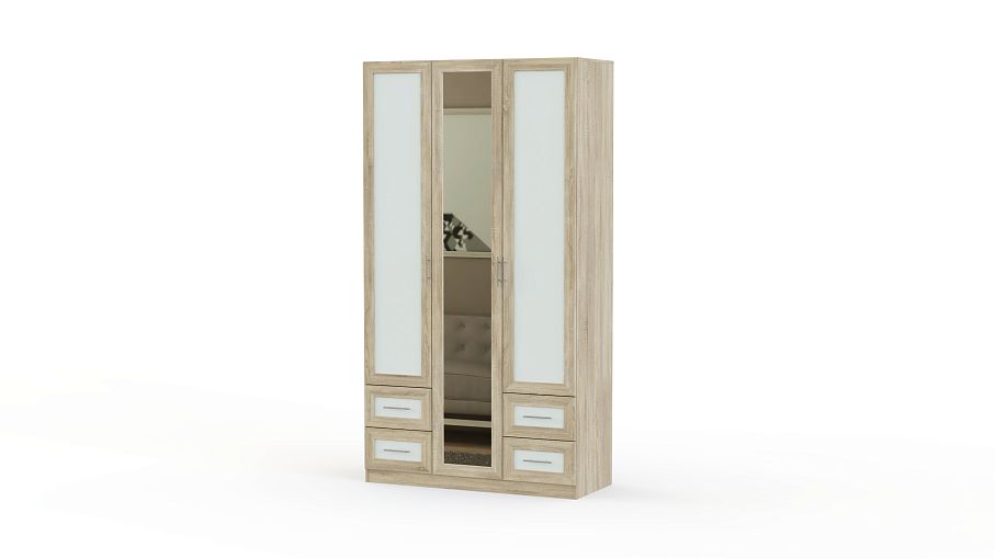 Распашной шкаф Крона 18 BMS станет прекрасным решением как для просторных, так и для небольших помещений благодаря удобным средним габаритам. Выполненный в контрастном сочетании древесных тонов и декорированный зеркалом в полный рост и рамочными фасадами, шкаф отличается не только долговечностью, но и станет настоящим украшением комнаты. За распашными дверцами располагаются платяное отделение и бельевые полки, в нижней части – выдвижные ящики для мелочей. Купить распашной шкаф Крона 18 BMS вы сможете в нашем интернет-магазине.