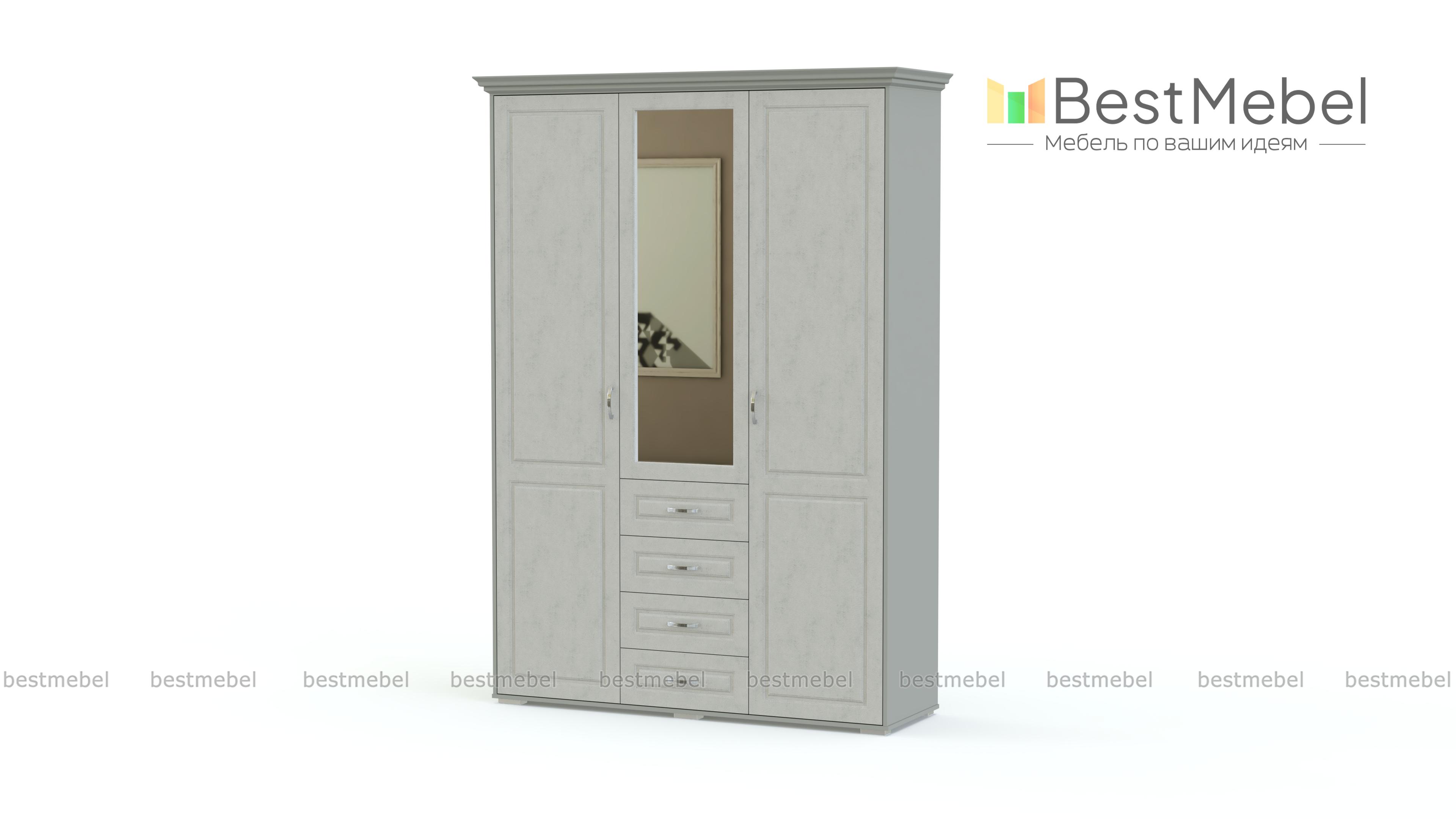 Распашной шкаф Мирма 4 BMS с классической фрезеровкой на карнизе и фасадах выполнен из материалов высокого качества в трендовом белом оттенке. Удобная система хранения трехдверного шкафа включает в себя распашные отделения с полками и штангой и четыре выдвижных ящика, оснащенных ручками-скобами. Зеркало на фасаде делает комфортным уход за собой и визуально облегчает конструкцию. Купить распашной шкаф Мирма 4 BMS для меблировки уютной современной спальни вы сможете в нашем интернет-магазине.