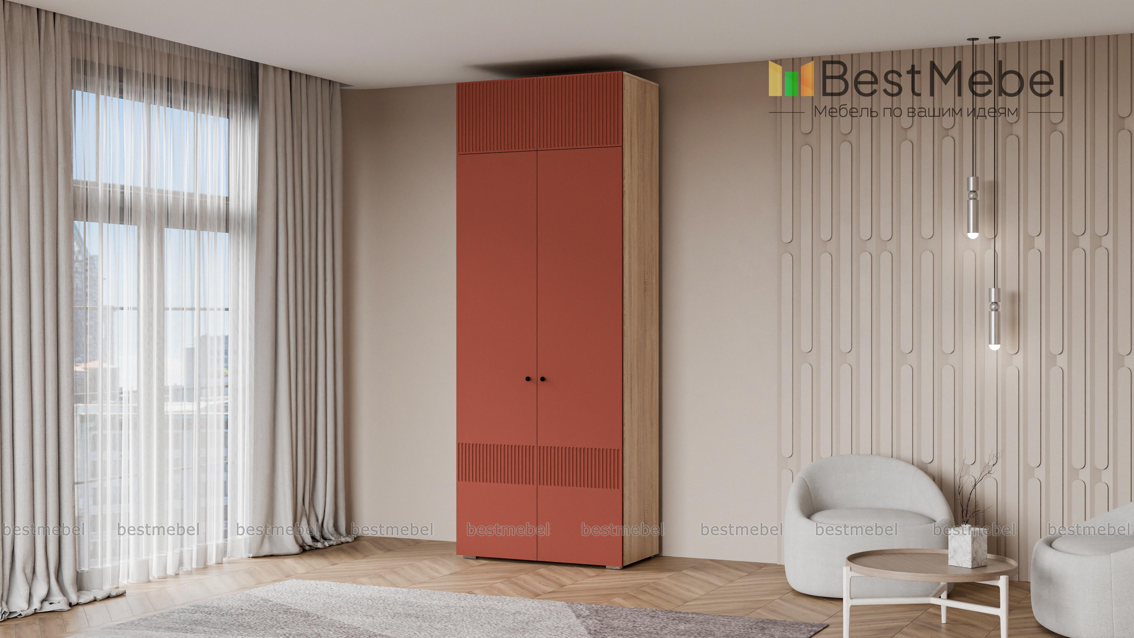 Шкаф распашной Джосс 8 BMS поможет эстетично организовать хранение, даже если пространство ограничено. За двумя дверцами, украшенными вертикальной фрезеровкой, — платяное отделение для одежды на вешалках и полка под коробки с аксессуарами. Дополнительный отсек сверху добавляет небольшому шкафу полезного объема, позволяя разместить сезонные или габаритные вещи. Купить шкаф распашной Джосс 8 BMS, изготовленный по индивидуальным размерам, вы сможете на сайте нашего интернет-магазина.