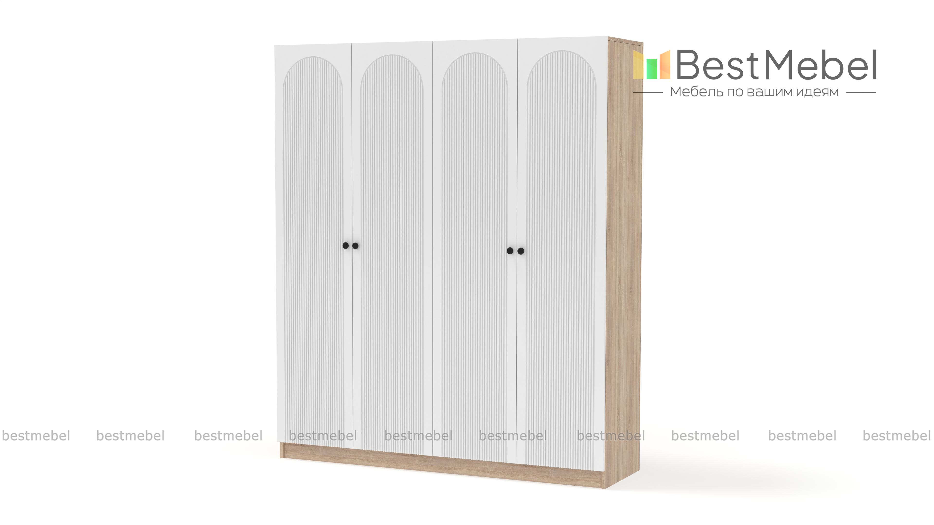 Шкаф распашной Рене 29 BMS — вместительный и очень стильный в темном оформлении. Фасад этой четырехдверной модели, изготовленной из ламинированной ДСП и МДФ, украшает геометричная фрезеровка с элегантными арками, на дверцы установлены небольшие круглые ручки. Два платяных отделения — оптимальное решение для хранения одежды, обуви и аксессуаров двух человек. Купить шкаф распашной Рене 29 BMS вы сможете на сайте нашего интернет-магазина, по желанию изменив размеры, цвет и компоновку.