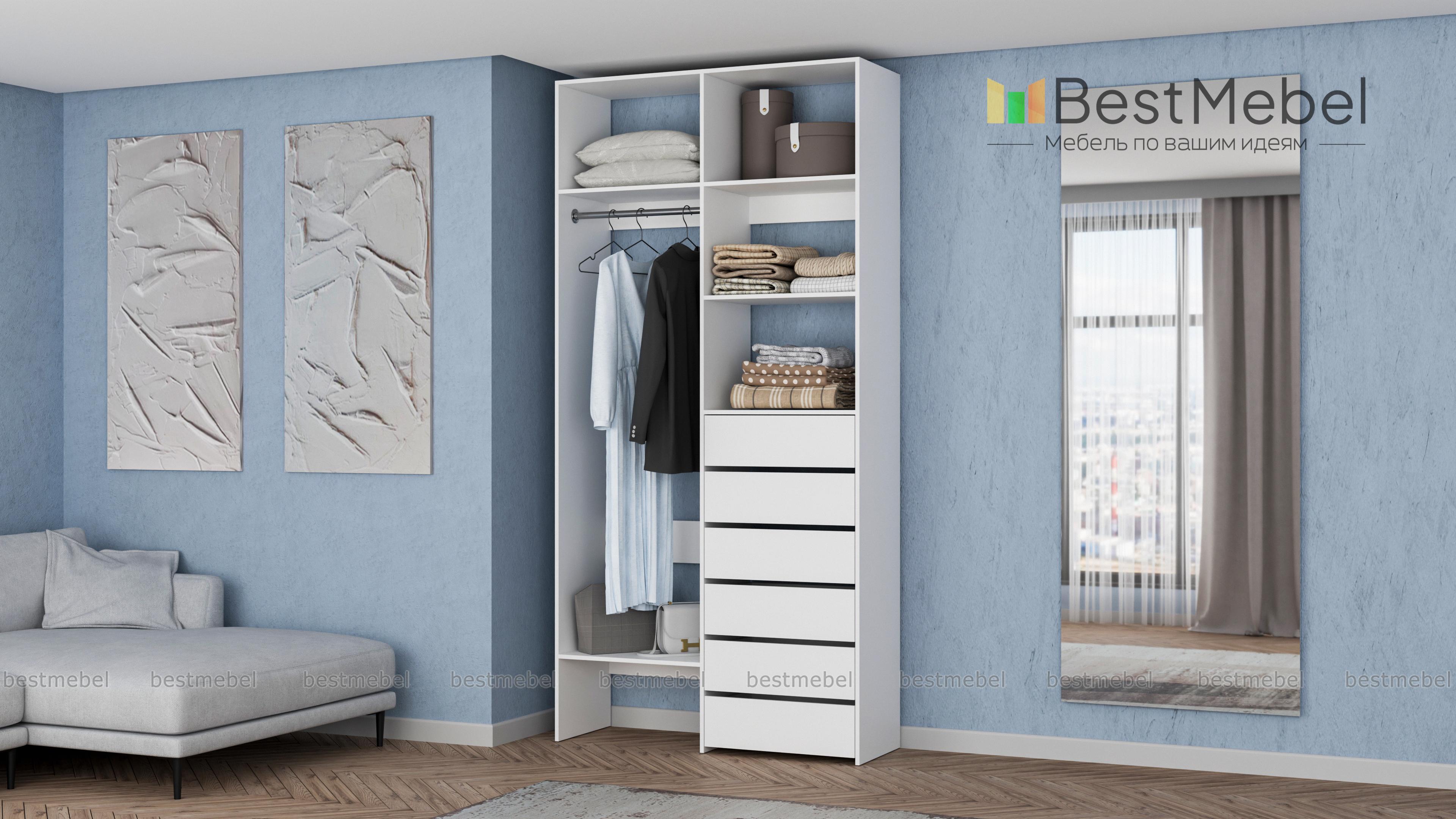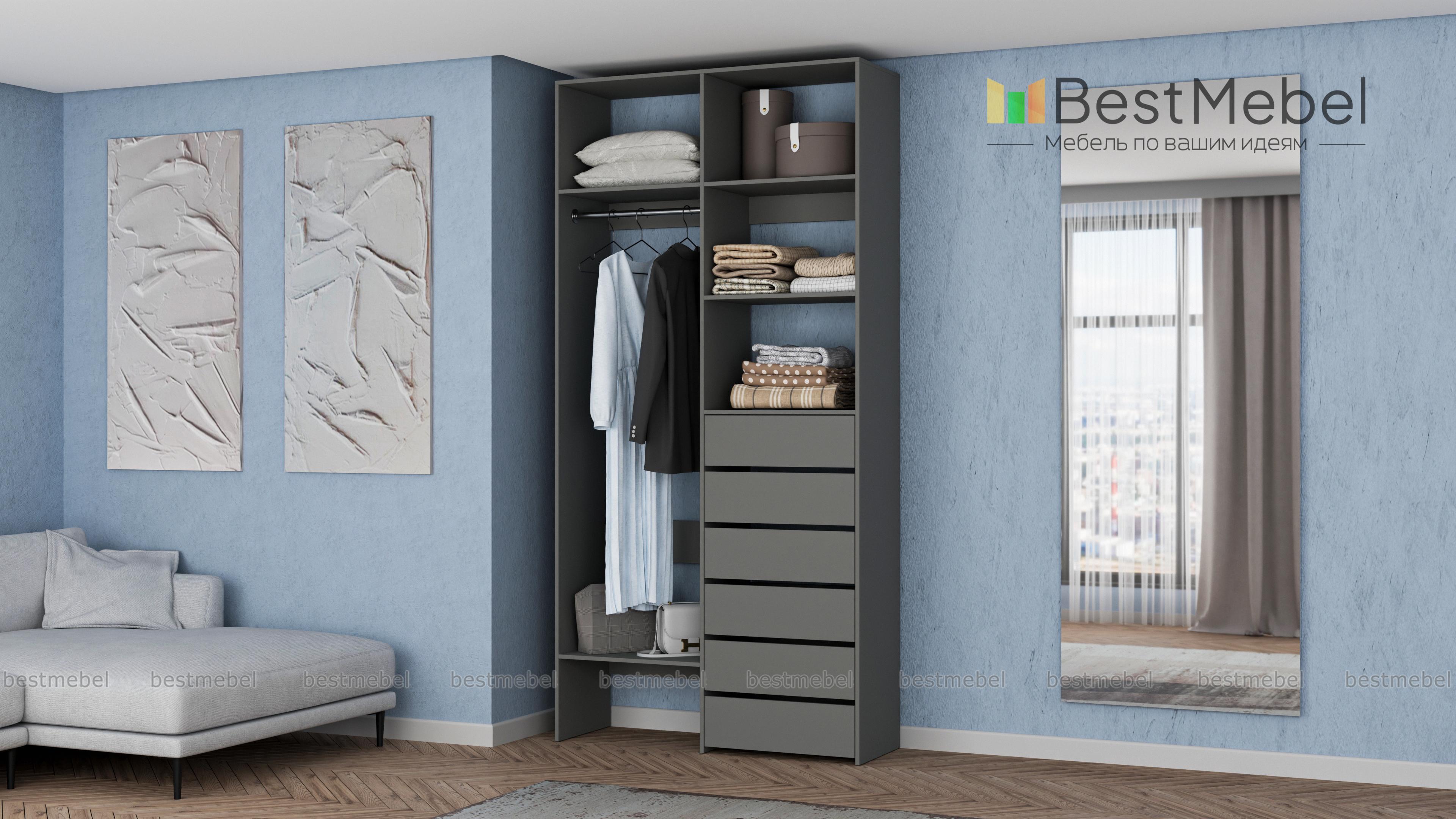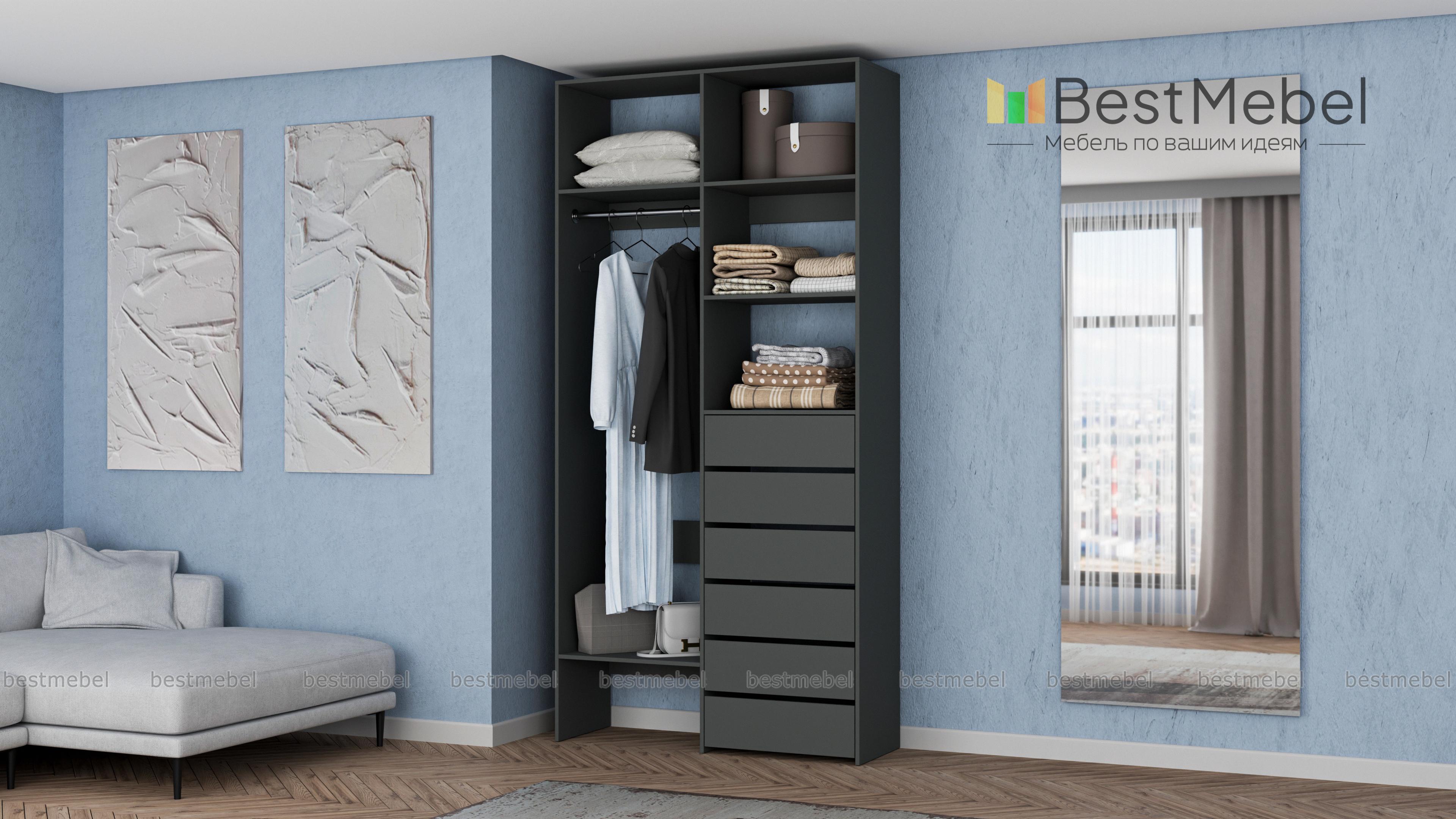 Стеллаж для одежды Мирта 38 BMS включает в себя разноплановые отделения для максимально удобного хранения. Платяное отделение слева и ряд из шести выдвижных ящиков справа дополнены вместительными бельевыми полками. Благодаря изготовлению из ламинированной ДСП стеллаж доступен по цене, прост в уходе и имеет широкую цветовую палитру. Купить стеллаж для одежды Мирта 38 BMS в необходимом вам размере и цвете вы всегда сможете на сайте нашего интернет-магазина.