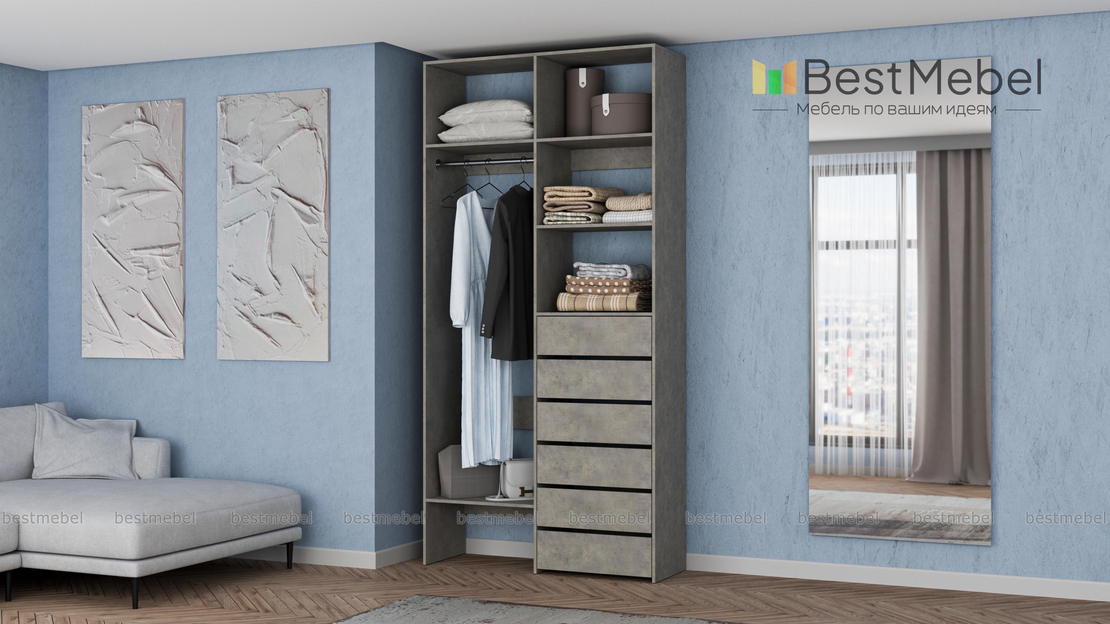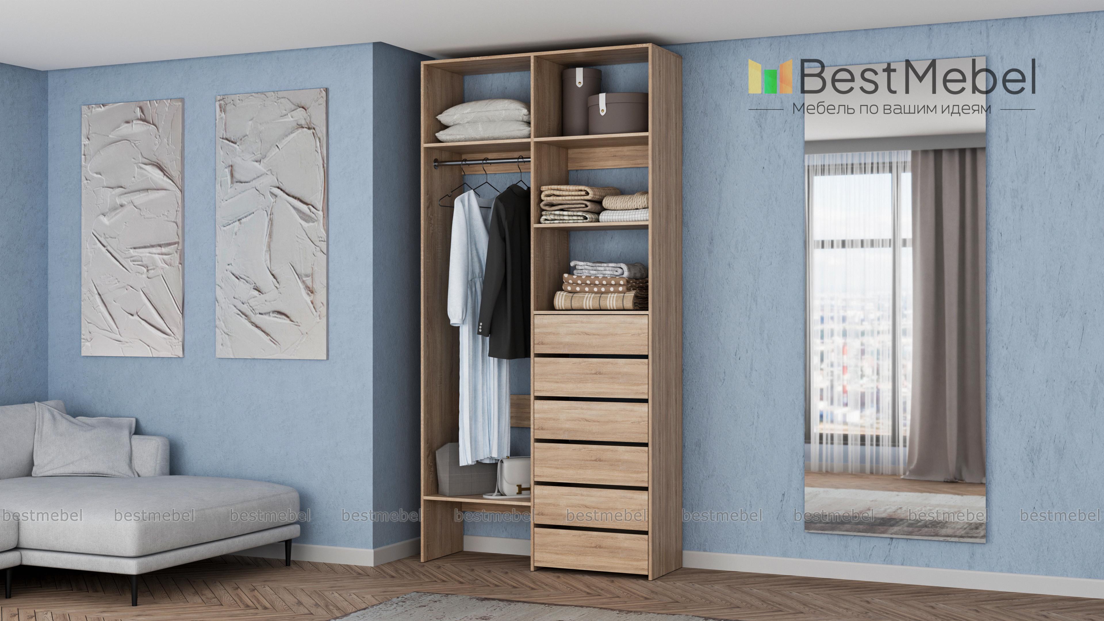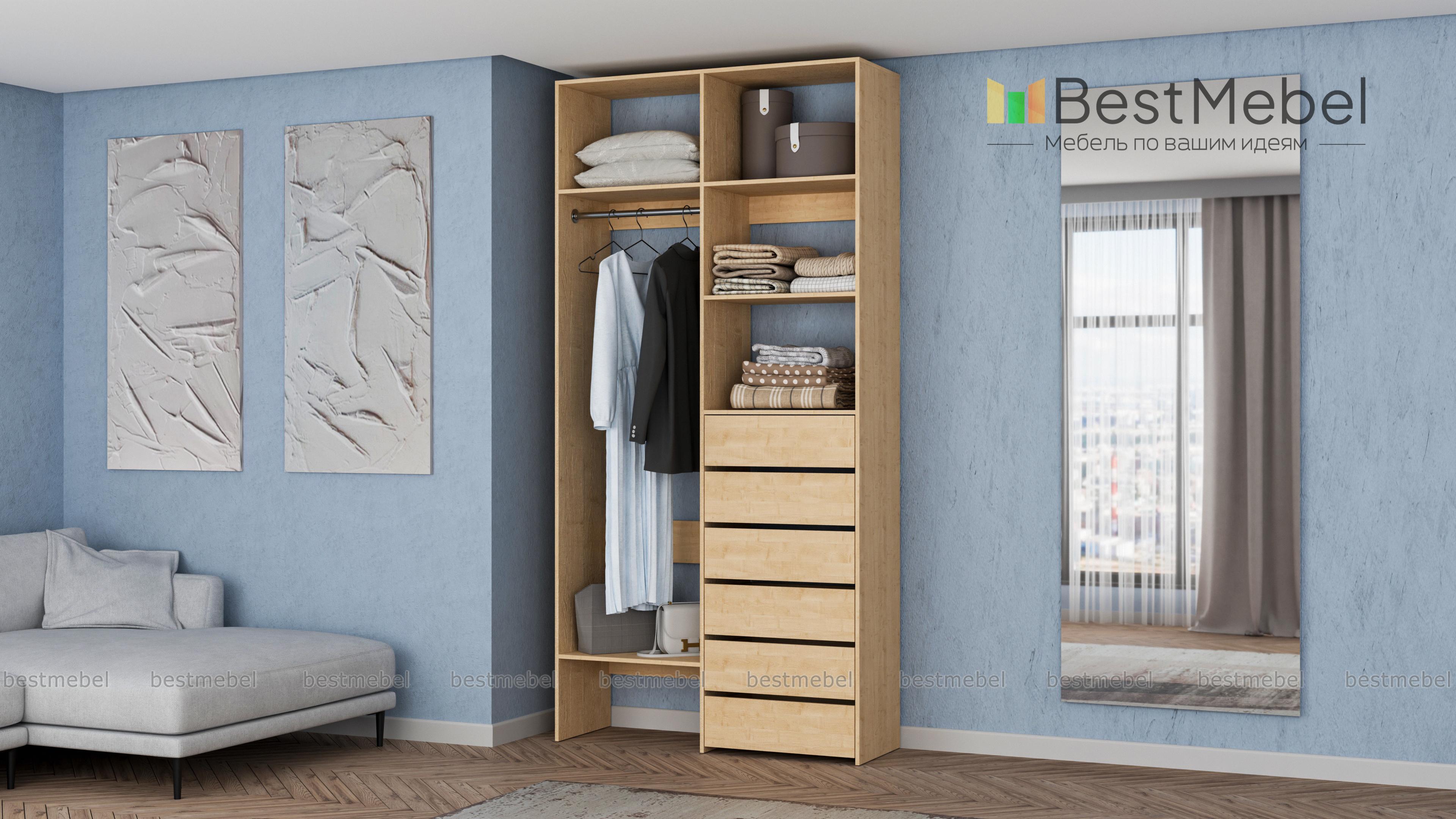 Стеллаж для одежды Мирта 38 BMS включает в себя разноплановые отделения для максимально удобного хранения. Платяное отделение слева и ряд из шести выдвижных ящиков справа дополнены вместительными бельевыми полками. Благодаря изготовлению из ламинированной ДСП стеллаж доступен по цене, прост в уходе и имеет широкую цветовую палитру. Купить стеллаж для одежды Мирта 38 BMS в необходимом вам размере и цвете вы всегда сможете на сайте нашего интернет-магазина.