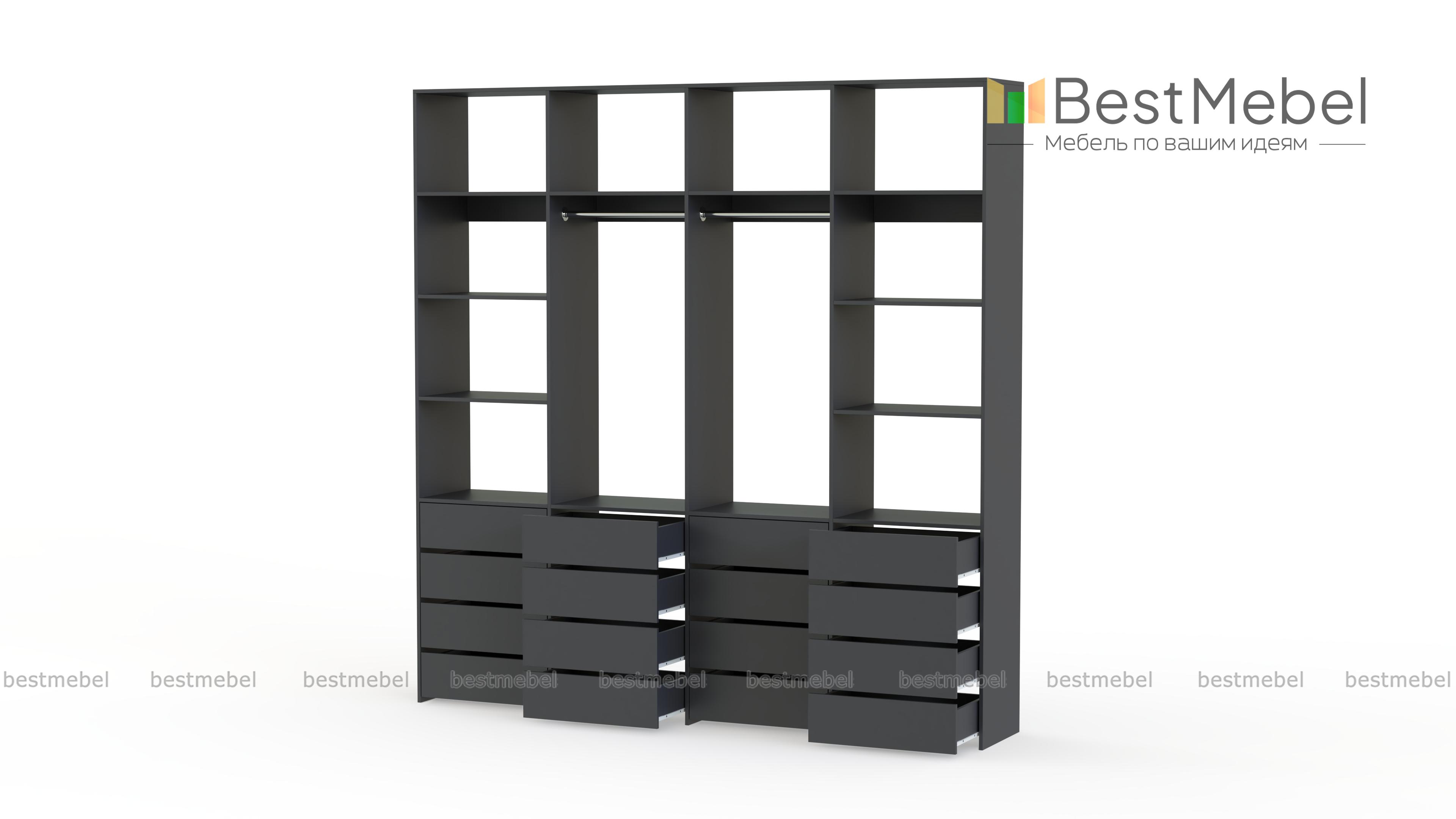 Стеллаж для одежды Мирта 63 BMS — это продуманная система хранения и функциональный современный дизайн. Две штанги и полки помогут разместить вешалки с одеждой, обувные коробки и текстиль, а четыре ряда выдвижных ящиков станут полноценной заменой бельевому комоду. Для изготовления стеллажа использована ламинированная ДСП высокого качества и надежная фурнитура. Купить стеллаж для одежды Мирта 63 BMS с выбором размера и цвета по каталогу приглашаем в наш интернет-магазин.