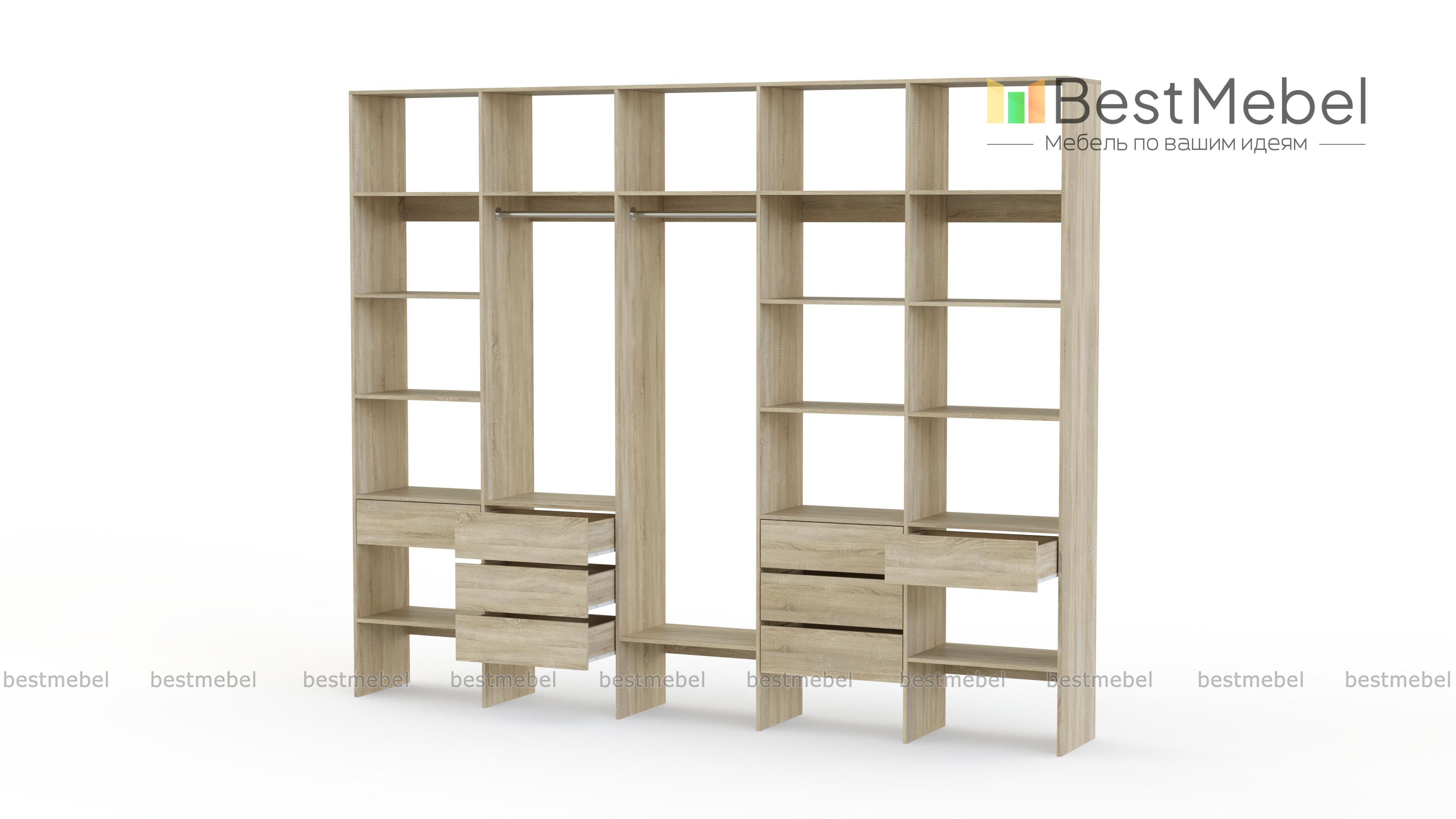 Стеллаж для одежды Мирта 72 BMS поможет вам обустроить зону для хранения вещей. Пять секций стеллажа оборудованы полками, двумя штангами и комбинацией из восьми выдвижных ящиков, позволяя выделить зоны для разных типов одежды, обуви и аксессуаров. Ламинированная ДСП в сочетании с качественной фурнитурой создает долговечную и эстетичную конструкцию. Купить стеллаж для одежды Мирта 72 BMS, подобрав оптимальные размеры и оттенок для вашего интерьера, приглашаем в наш интернет-магазин.