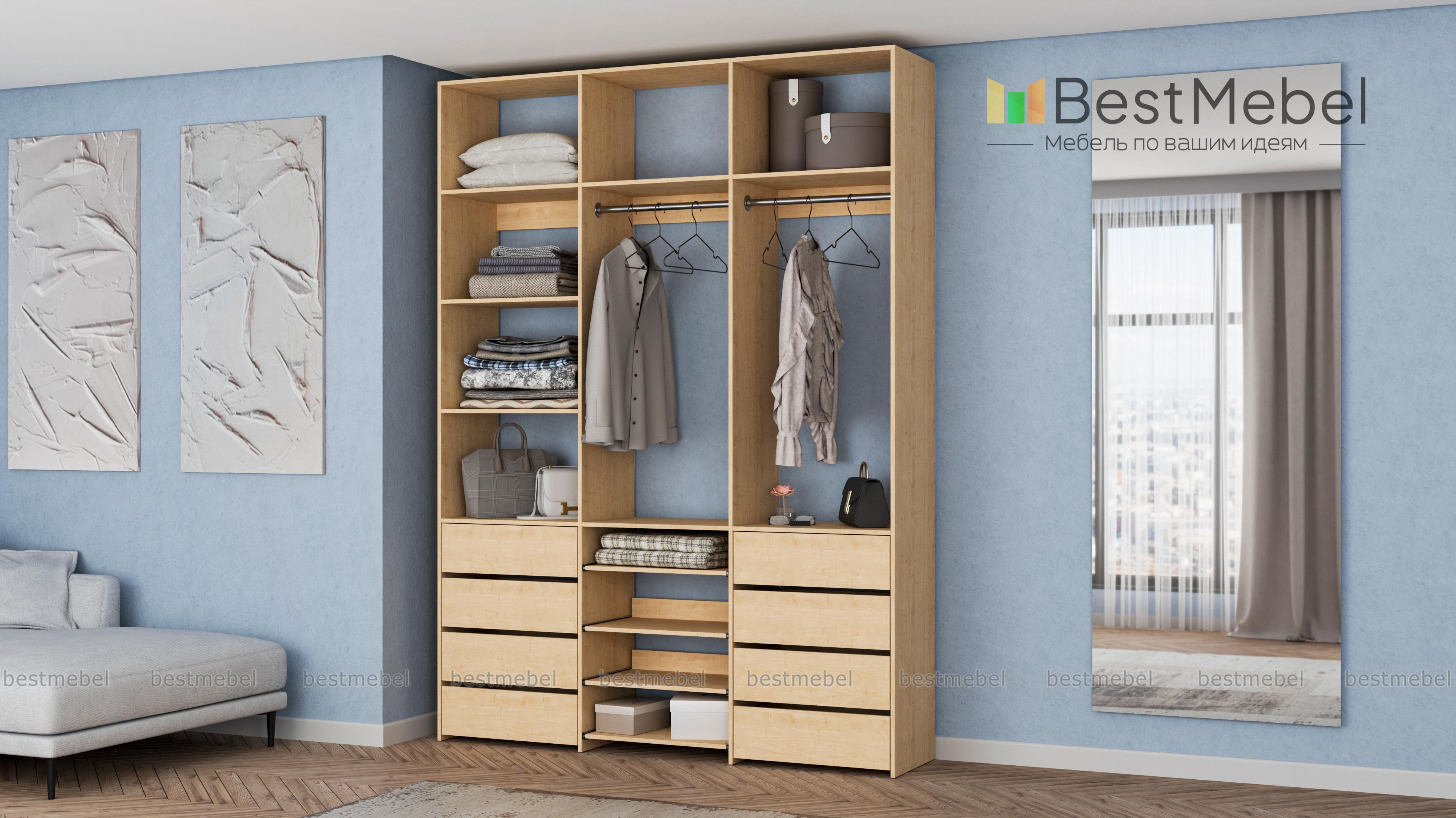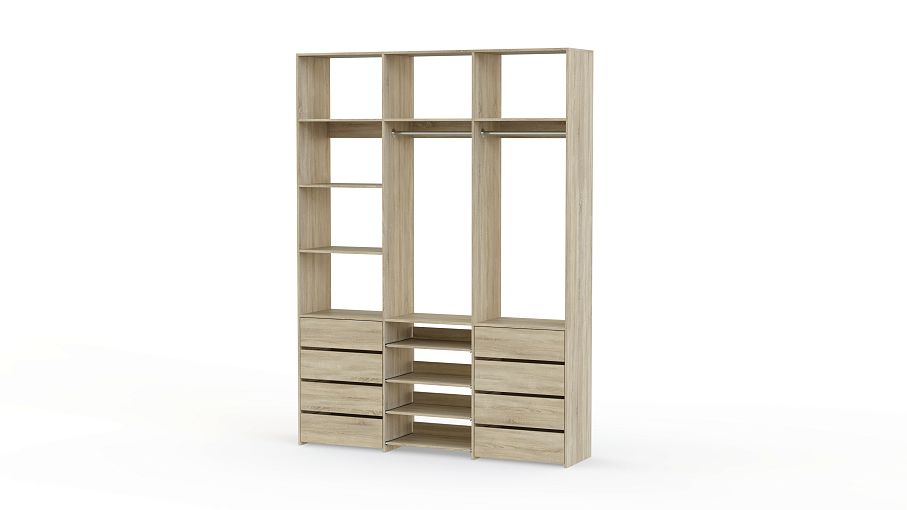 Стеллаж для одежды Мирта 97 BMS имеет открытую конструкцию и облегчит доступ к вещам. Две секции со штангами дополнены просторными полками для сложенных вещей и коробок, а в нижней части располагаются два ряда ящиков для белья и мелочей и выдвижные панели. Нейтральный древесный оттенок подходит почти к любому интерьеру, а ламинированная плита обладает прочностью и долговечностью. Купить стеллаж для одежды Мирта 97 BMS, изготовленный по вашим размерам, приглашаем в наш интернет-магазин.