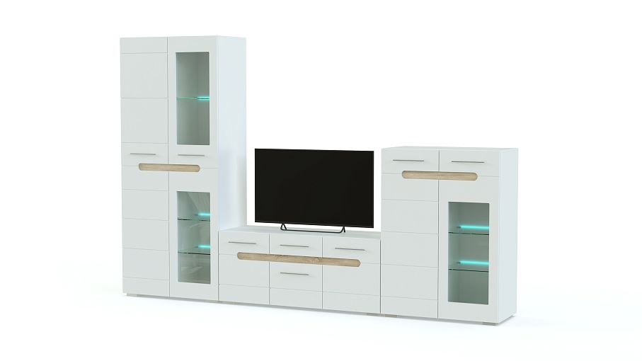 Практичная и эффектная стенка Бьянко BMS станет отличным дополнением современной гостиной. Выполненная в светлых тонах, она смотрится легкой и не будет перегружать интерьер. Фрезерованные фасады с декоративными вырезами и эргономичной фурнитурой просты в уходе и долговечны. Модульная конструкция позволит максимально удобно для вас расположить отдельные элементы. В комплект входят просторная тумба под ТВ, шкаф и высокий комод, комбинированные с застекленными витринами.