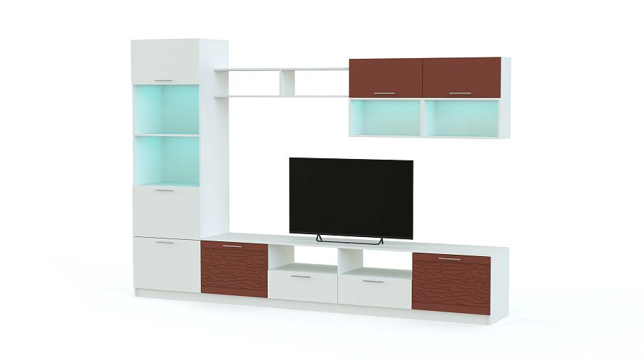 Стенка Вельвет 23 BMS поможет оформить зону ТВ, разместить книги, предметы декора и разнообразные домашние мелочи. Лаконичный модульный комплект станет прекрасным выбором для современных гостиных в стиле минимализм. Среди элементов низкая широкая тумба с распашными дверцами, ящиками и нишами, напольный комбинированный шкаф, открытые полки и навесной модуль. Сочетание матовых поверхностей с 3D рисунком и подсветки придает стенке особенно эффектный вид. Купить стенку Вельвет 23 BMS, подобрав необходимые параметры, вы сможете в нашем интернет-магазине.