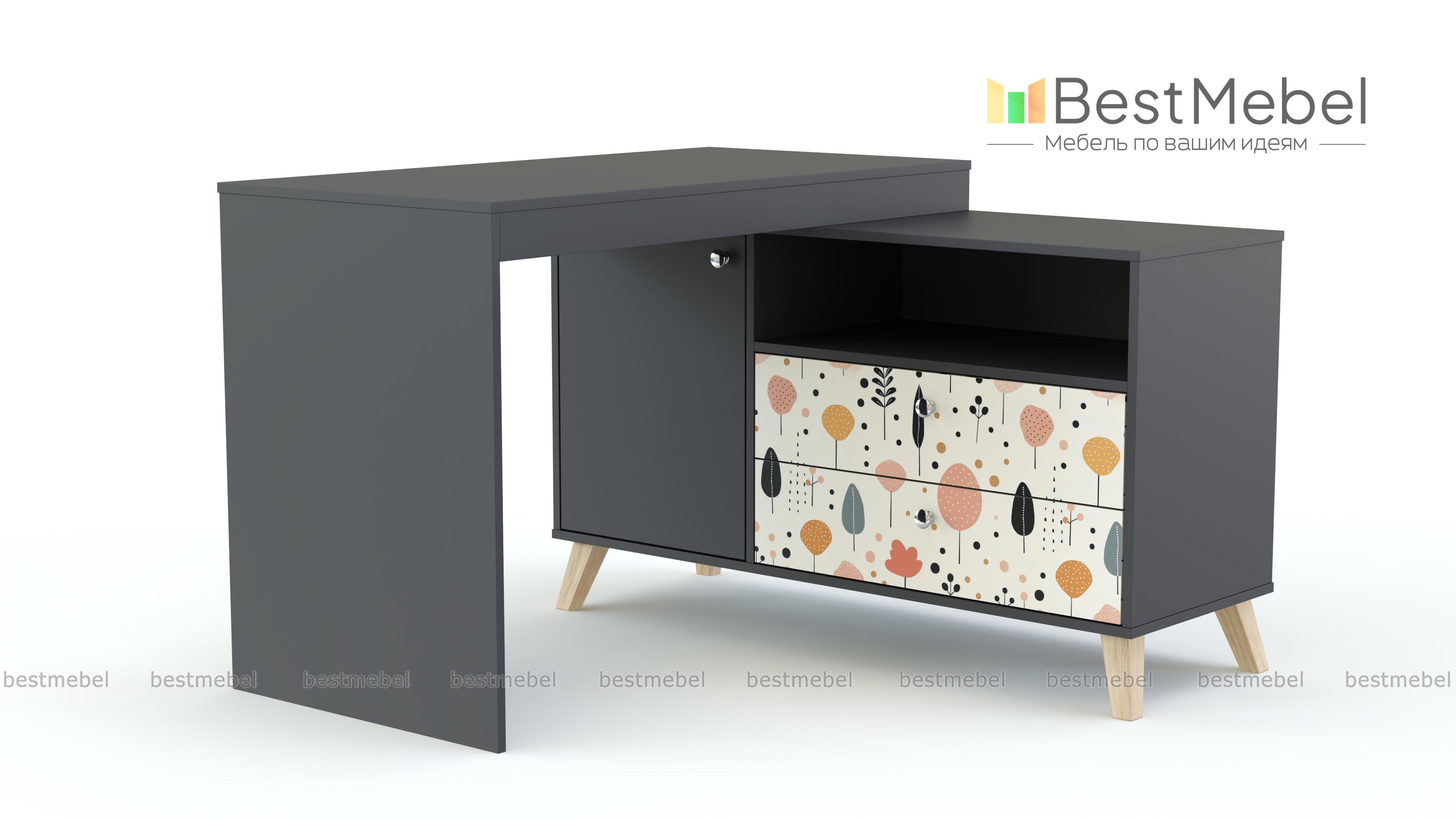 Стол письменный Эльза 1 BMS имеет угловую форму, позволяя задействовать неиспользуемое ранее пространство. Просторная прямоугольная столешница опирается на широкую тумбу, оборудованную распашным отделением, двумя выдвижными ящиками и нишей для хранения тетрадей, папок и учебников. Легкость конструкции обеспечивают высокие ножки и светлая цветовая гамма с нежной акцентной фотопечатью. Купить стол письменный Эльза 1 BMS в оттенках нашего каталога вы сможете на сайте интернет-магазина.