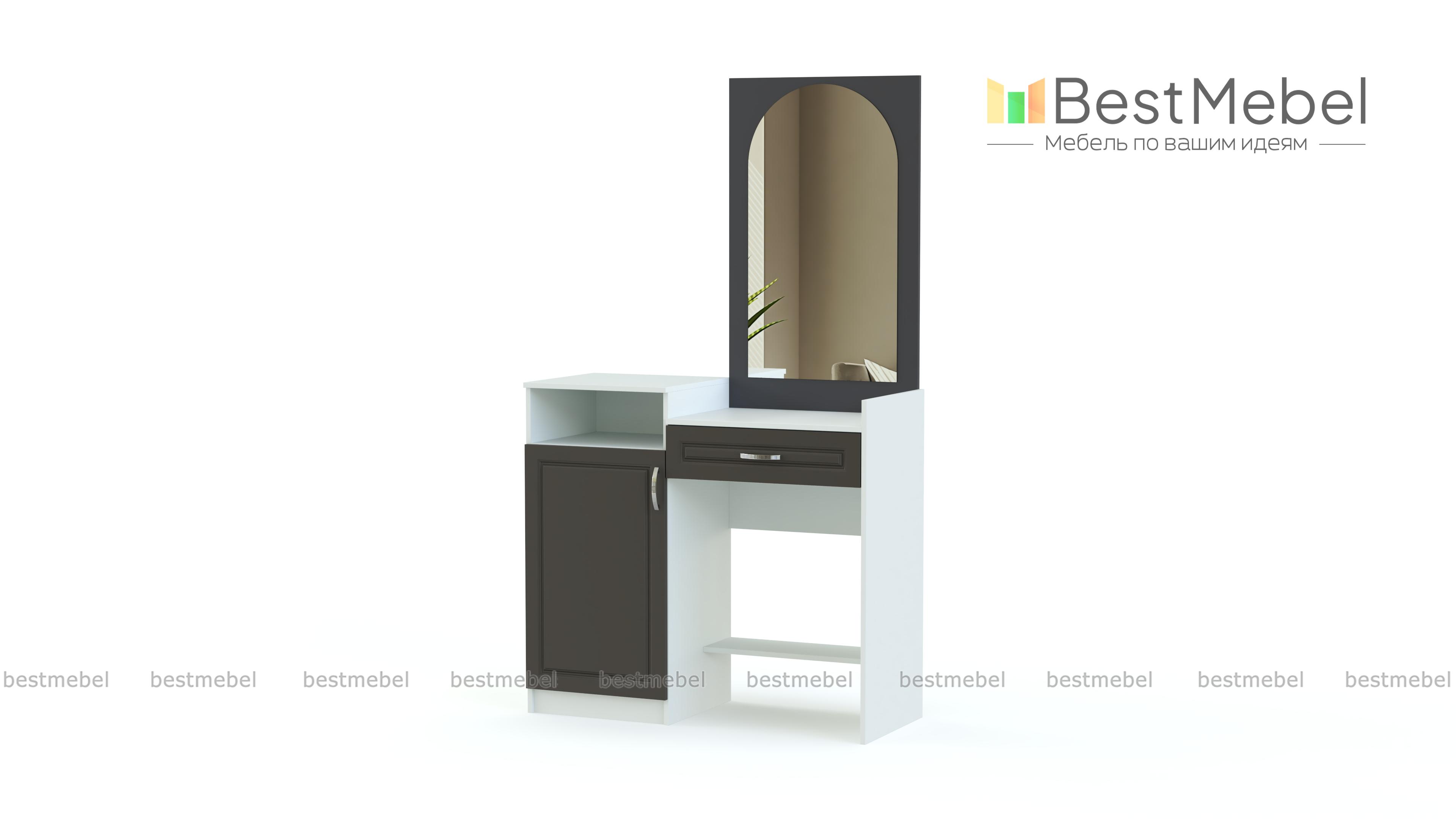Стол туалетный Ланистер 21 BMS станет практичным дополнением современного спального гарнитура. Модель отличается компактными размерами и оригинальным дизайном. Выполненный в контрастных тонах и украшенный по фасаду фрезеровкой, столик оборудован столешницей с выдвижным ящиком для мелочей, высокой тумбой с нишей и распашным отделением и панелью со скругленным зеркалом. Купить стол туалетный Ланистер 21 BMS и разместить все необходимые уходовые средства и предметы декора вам поможет наш интернет-магазин.
