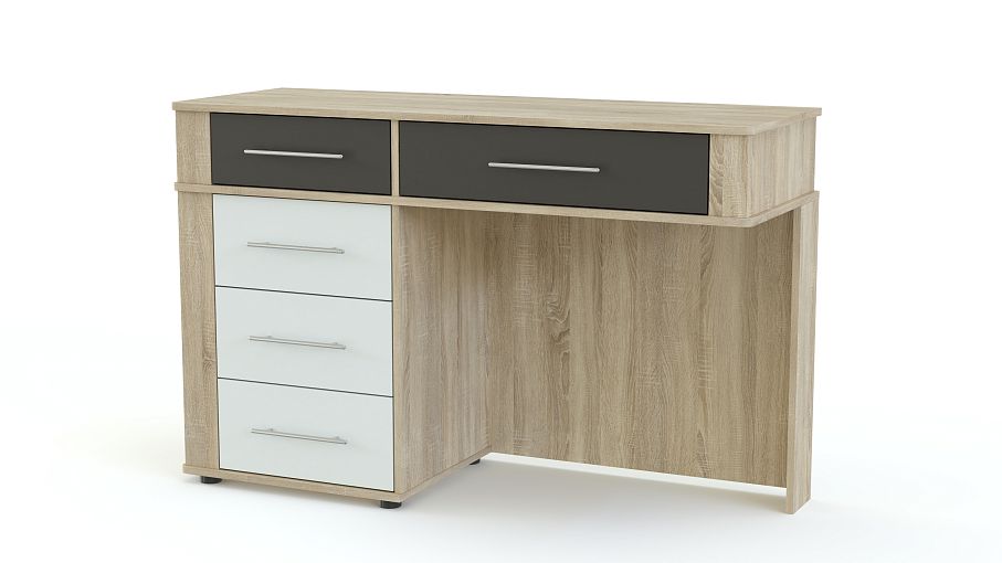 Туалетный столик Бруна BMS – это оригинальный дизайн и универсальная расцветка под массив дерева, которая гармонично впишется в большинство современных интерьеров. Модель отличается вместительностью и эргономичной формой, которые сделают уход за собой максимально комфортным. Столик оборудован просторной столешницей, двумя малыми и тремя большими выдвижными ящиками для мелочей с ручками-рейлингами, углы безопасно закруглены. Купить туалетный столик Бруна BMS для стильной и уютной спальни приглашаем по лучшей цене в наш интернет-магазин.