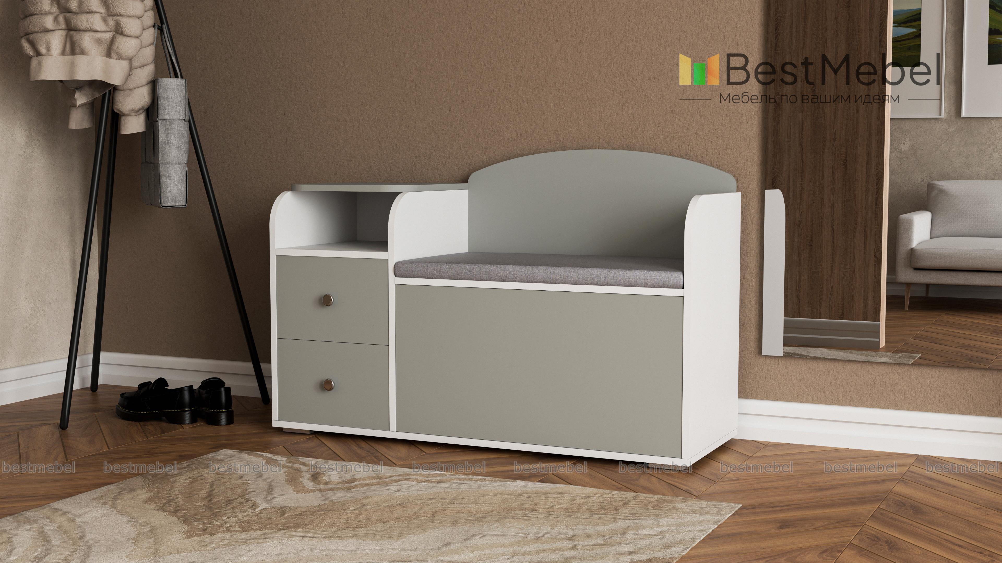 Тумба для обуви классная.Очень симпатично смотрится. Удобная и вместительная.Сидушка мягкая экокожа светлая.
