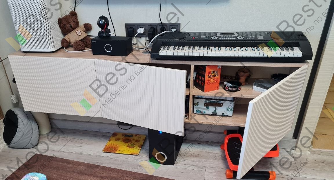 Красивая тумба для гостиной, собрали легко, исключение составили дверцы: при ширине тумбы 180 см, каждая дверца оказалась слишком тяжелой для мебельных петель, происходит перекос (опускание) свободного края дверцы. При ширине тумбы более стандартного рекомендуем увеличить количество секций до 4