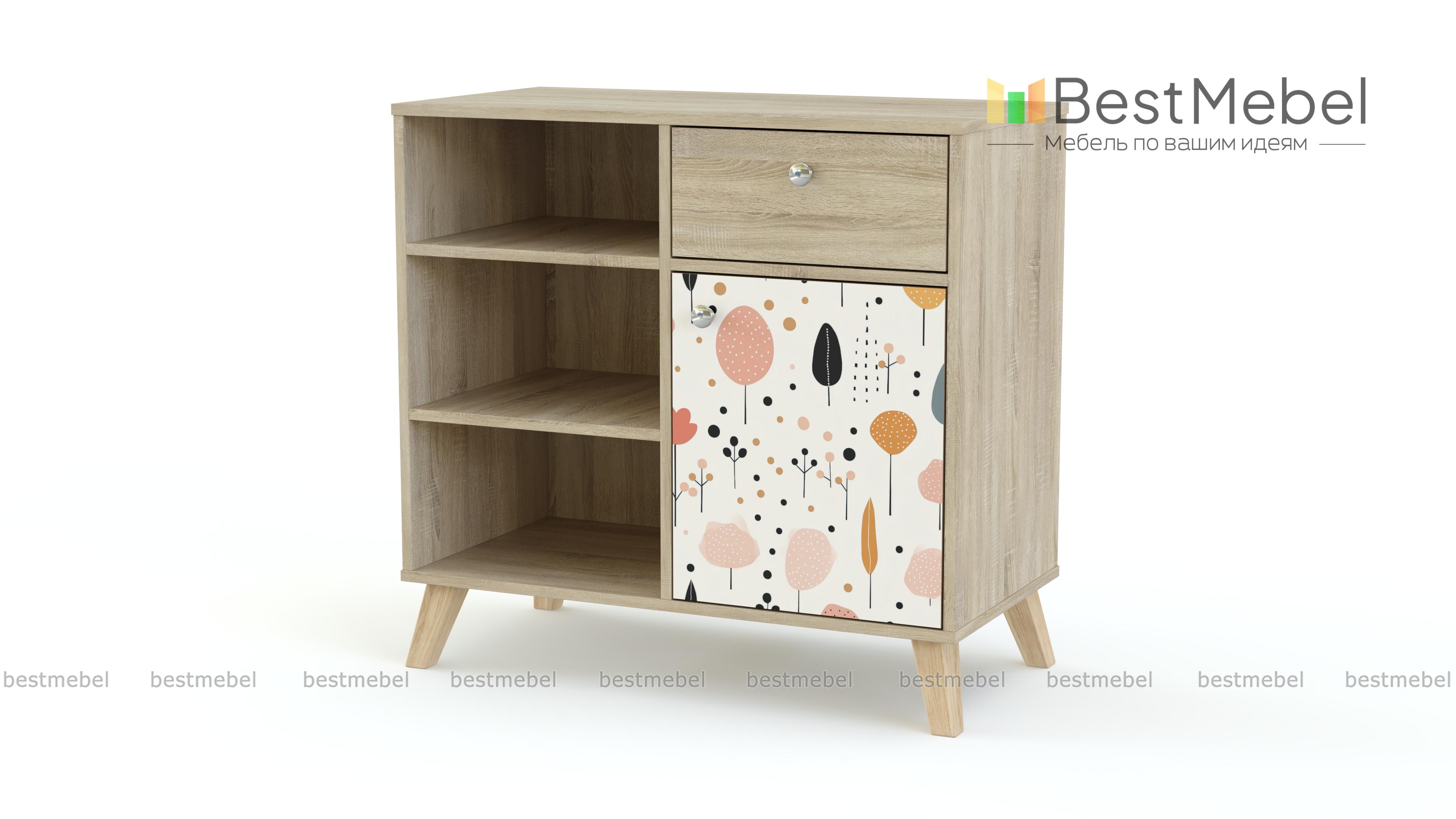 Тумба Эльза 4 BMS с высокими ножками в стиле сканди имеет простую удобную конструкцию, которой ребенку будет комфортно пользоваться. Слева располагаются полки для открытого хранения, а справа выдвижной ящичек для мелких предметов и распашная секция. На дверцу и ящик тумбы установлены эргономичные круглые ручки, распашной фасад украшает симпатичный нейтральный принт. Купить тумбу Эльза 4 BMS, вы сможете в нашем интернет-магазине, подобрав размеры, цвет и фурнитуру.