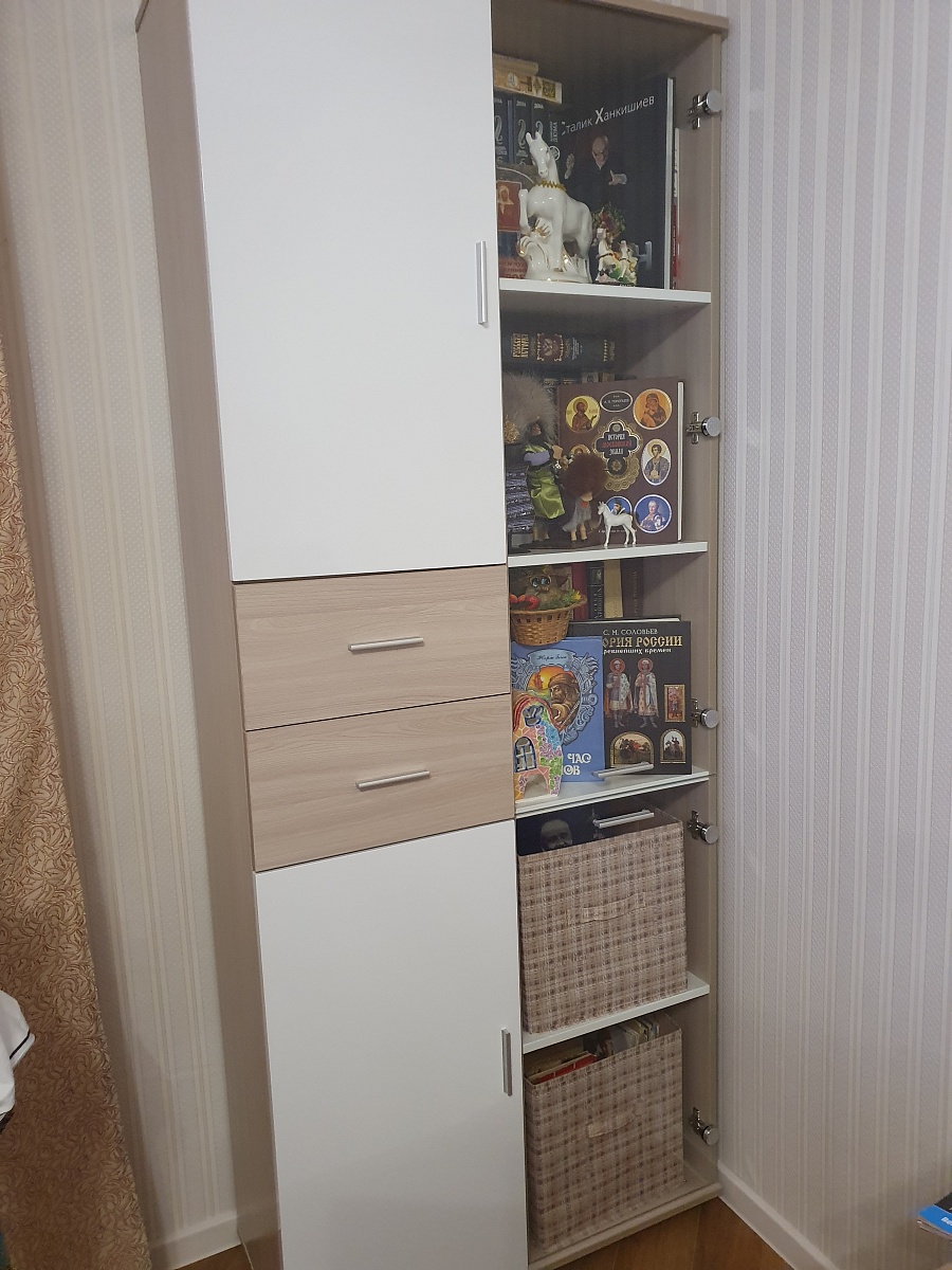 Шкаф смотрится идеально, вписался в уголок как родной. Был нужен шкаф для коллекции с дверями, так как дома кот, который вечно всё сносит. Выглядит маленьким, но всё влезло идеально. Смогла сделать его в цвет и стиль стола (ясень шимо светлый, чёрная кромка и такая ручка). Размеры: 400×2020×400. Всем довольна, изделие пришло без косяков.