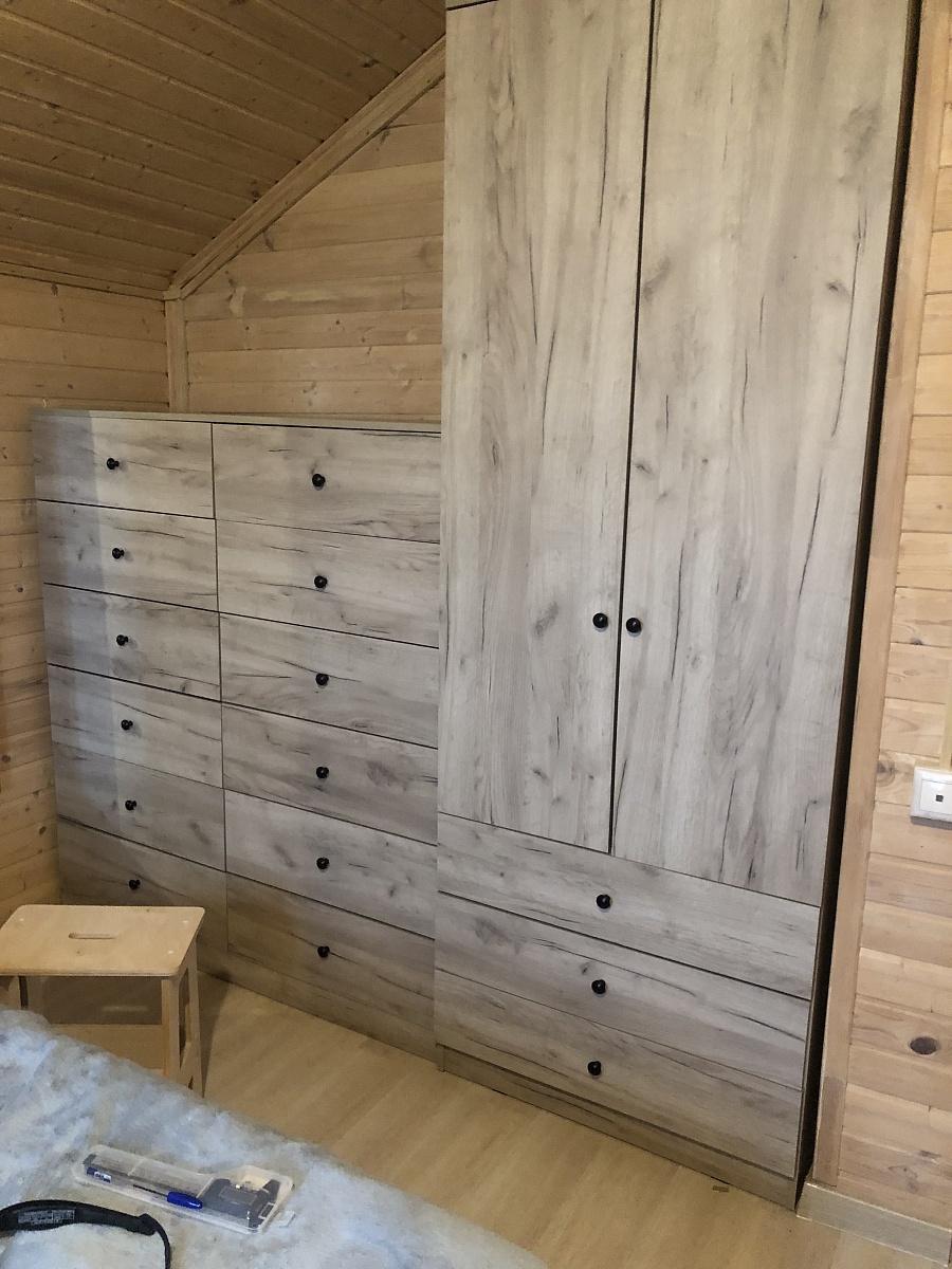 +Качество материалов отличное, фурнитуры полный комплект, легкая сборка. Хороший, вместительный шкаф. - отверстия  под ручки на ящиках фасада и фальшфасада не совпадают Заказывала две доп полки , менеджер задала вопрос по присадке для полок , и здесь мы друг друга не поняли . Мне не нужна была штанга , хотелось шкаф с полками . В итоге получился шкаф со штангой и внизу две узкие полки , пришлось самим делать отверстия под полкодержатели. Это , как замечание к тому, что подобные нюансы надо более точно и подробно у клиентов уточнять . В целом впечатление хорошее , будем ещё заказывать мебель .