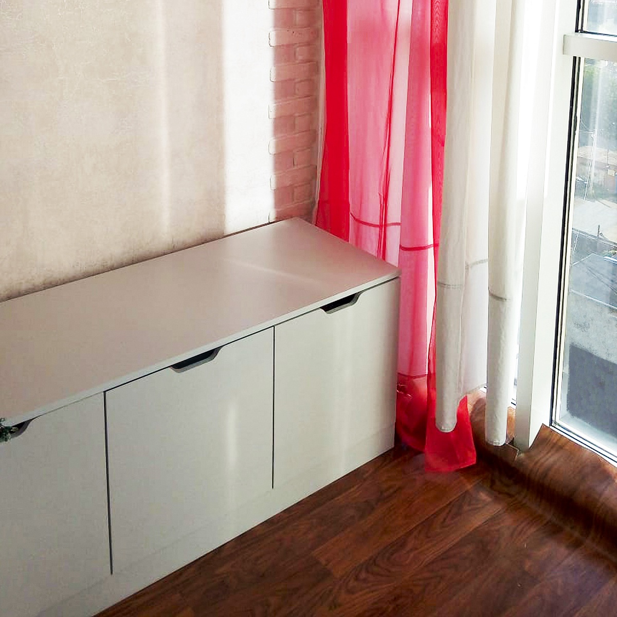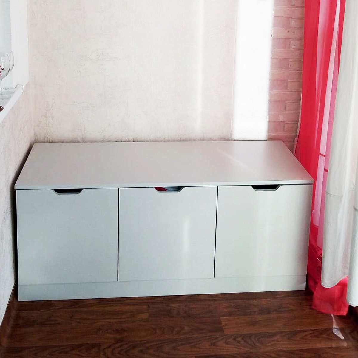 Мой заказ 1061494 был доставлен мне совсем недавно. Комод по моим размерам, цвет ЛДСП серый с вырезами вместо ручек. Всё как на картинке. Ничего лишнего. Прекрасно вписался в мой стиль. Собирала сама, - сложностей не возникло. Стоит прочно,  на лоджии. Крепкая конструкция, очень ёмкие выдвижные ящики. Иногда использую комод для сидения) Уверена, что ему не повредит.
