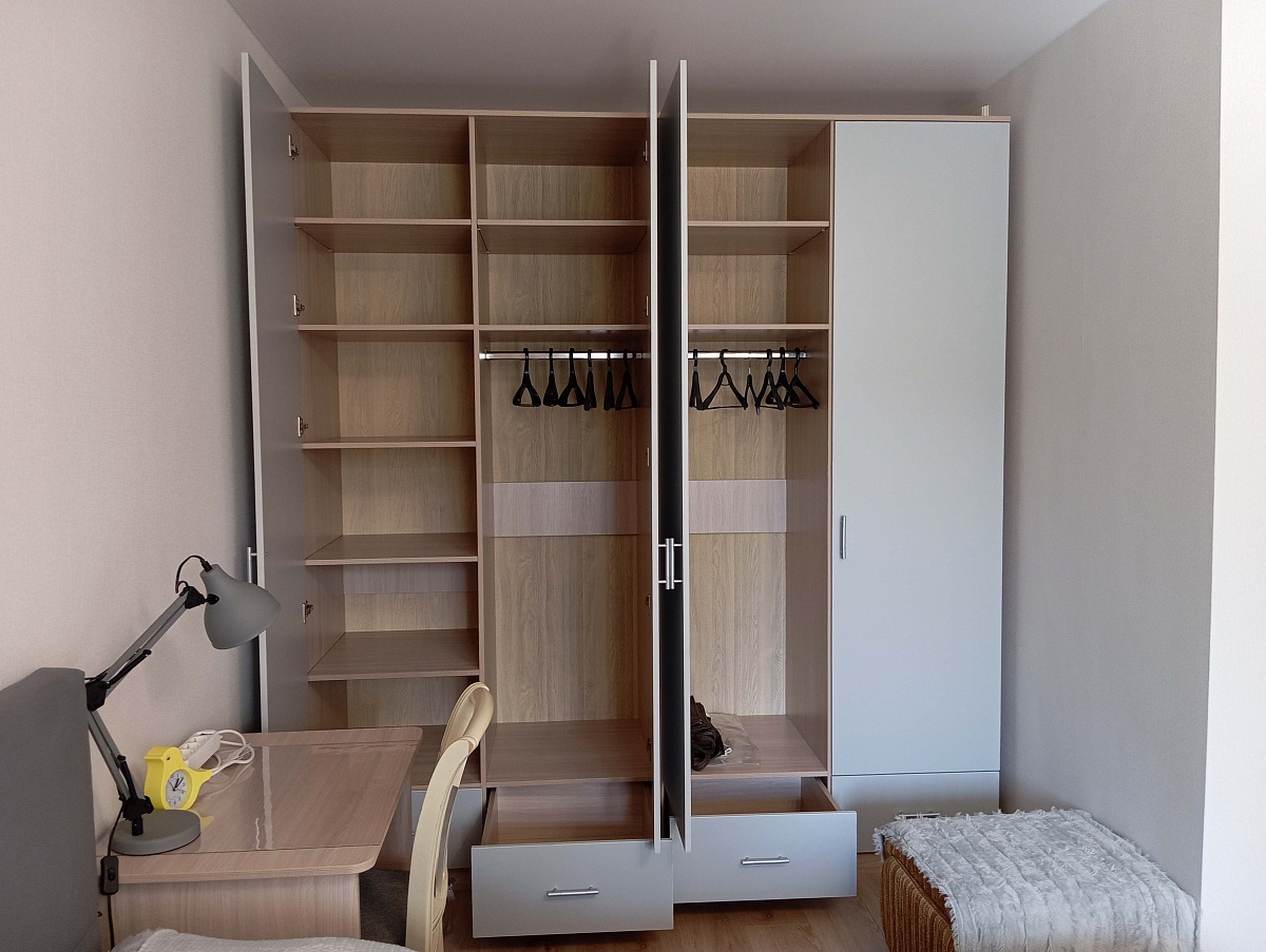 Заказ №891627 от 05.10.2023. Шкаф нужен был по индивидуальным размерам и с корректировкой внутреннего наполнения. По моей просьбе убрали один выдвижной ящик внизу, добавили на половину шкафа штангу. Такая возможность в BMS для меня является большим преимуществом по сравнению с многими другими фирмами. Результатом очень довольна. Благодарна за работу фирмы на всех этапах. Цвет Ясень Шимо Светлый/ Серый.  00000522957   Шкаф Эконом 8 BMS (1100х2400х630)