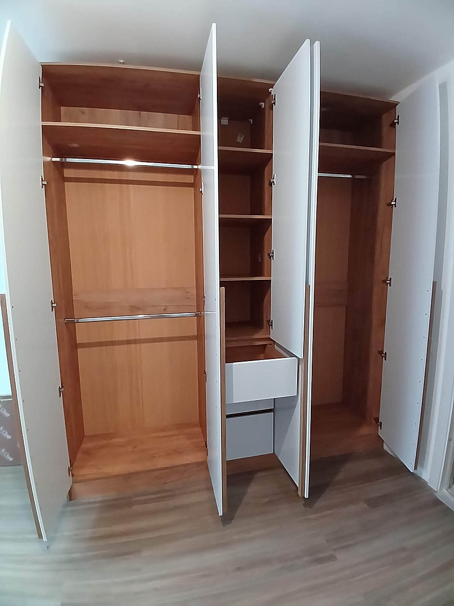 Шкаф очень красивый, дверцы с фаской, выглядит стильно. Удобный - если брать петли с доводчиком. Единственный недостаток проекта - ручки дверей, 120 см, это просто палка из лдсп, установленная ребром на фасад, с кромкой по внешней стороне, выглядит хлипко и установлена только на половине дверей, неудобная и непрактичная идея, поэтому сразу заменили на г-ручки из массива дуба - и за эти лдсп минус звезда в качестве. И, пожалуй, сейчас я бы взяла ещё и две дополнительные полки в широкие отделения, свободное место для них там есть. Заказывали на 25 см уже стандарта. Всё сделали быстро. Изготовили за неделю - привезли в спб сразу, в течение недели довезли фурнитуру и забытые фасады ящиков. Ничего не было побито, упакован очень хорошо. Сборщика от магазина пришлось подождать, но не пожалели, что не собирали сами - некоторые присадочные для саморезов петель были не там, а местами соединения было невозможно реализовать из-за ракурса сборки - уголки по факту заменили на дополнительные конфирматы.