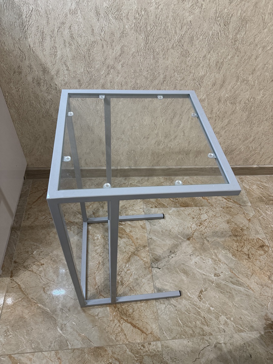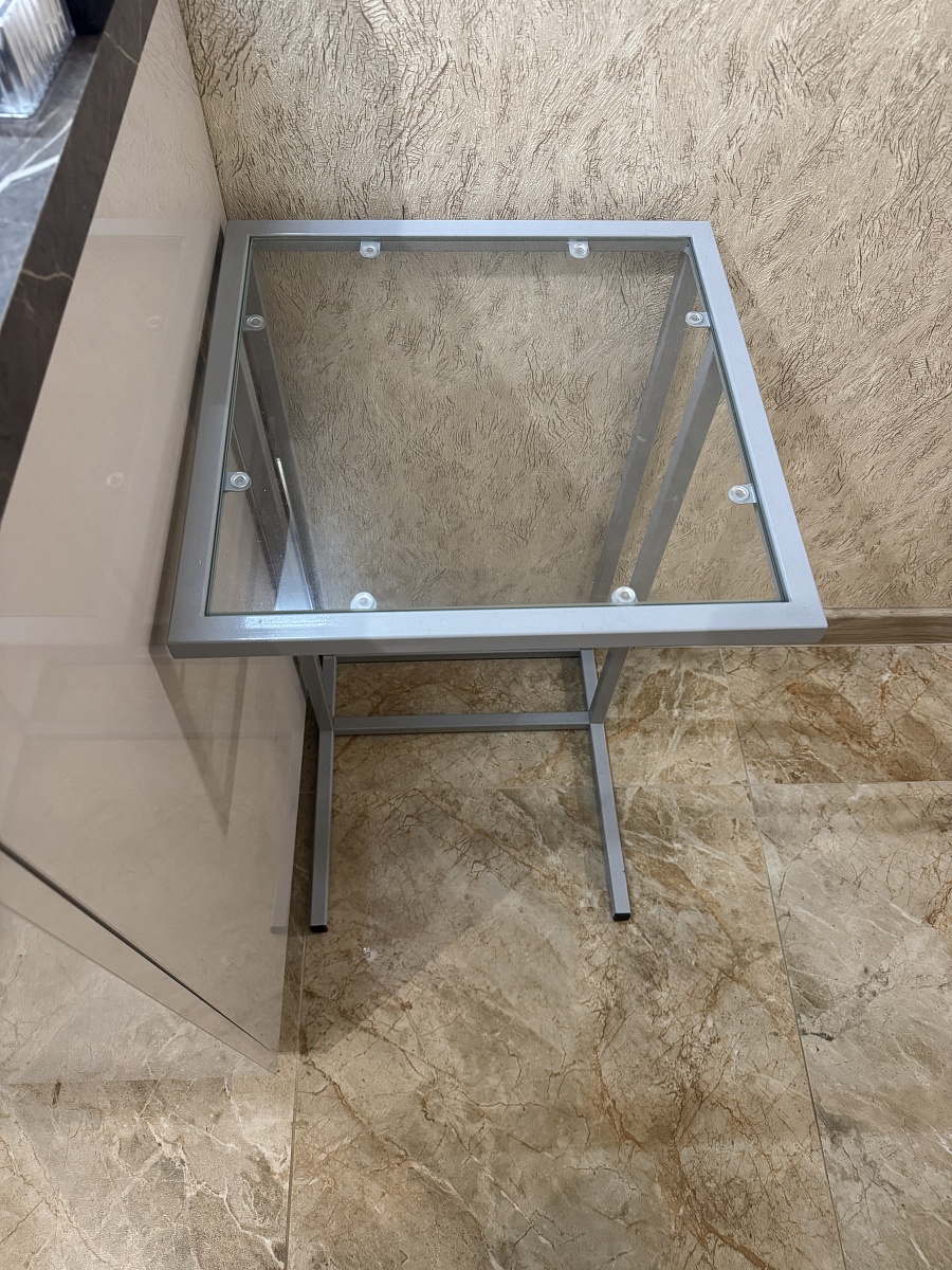 Столик отличный. Заказывали под электрический гриль размером 40*70*40. Выполнен качественно и с бонусами вышло достаточно дешево. Стекло каленое, не должно разбиться в случае чего. Под столик поставили мусорное ведро для экономии места. Заказ номер 00000263486