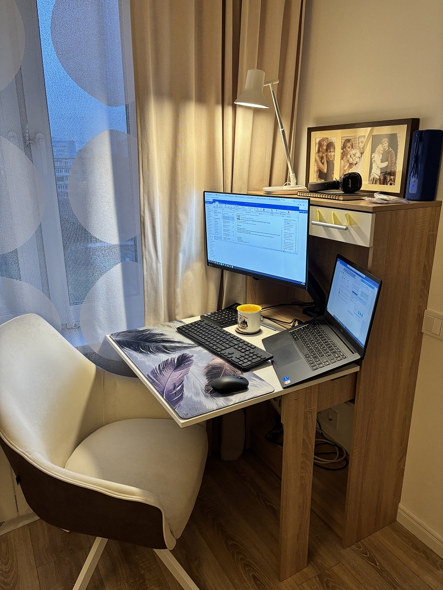 Хороший стол! Изготовили вовремя, очень удобно, что можно выбирать размеры, цвета, собирали самостоятельно, немного помаялись, потому что инструкции по сути нет, но справились!Кое-где доработали напильником: выпилы под плинтус сделали самостоятельно под размер и форму именно своего плинтуса, не стали ставить заднюю стенку снизу, чтобы не загораживать розетку, которая как раз там, с одной стороны в боковой панели у стены сделали небольшой выпил под шнур от лампы. Также важно понимать, что при стандартных размерах высоты, монитор 24” в полку не войдет! Даже у которого стойка регулируется по высоте и в самом нижнем положении - не войдет все равно. Если планируете ставить его туда - ставьте при заказе высоту больше стандартной и уточняйте высоту именно полки. Мы же решили этот вопрос покупкой кронштейна, который впилили прямо в столешницу (благо весь инструмент дома есть). По итогу на самом деле так даже лучше. В целом довольна очень, при очень скромных возможностях площади, которая у меня есть под рабочее место дома, при помощи этого чуда-стола я выжала из этой площади все! И в интерьер вписался как продолжение консоли под телевизором и остальной мебели. К качеству в целом, срокам изготовления и доставки претензий нет.