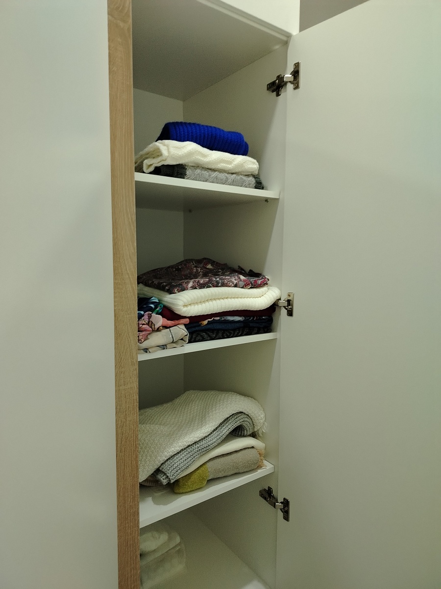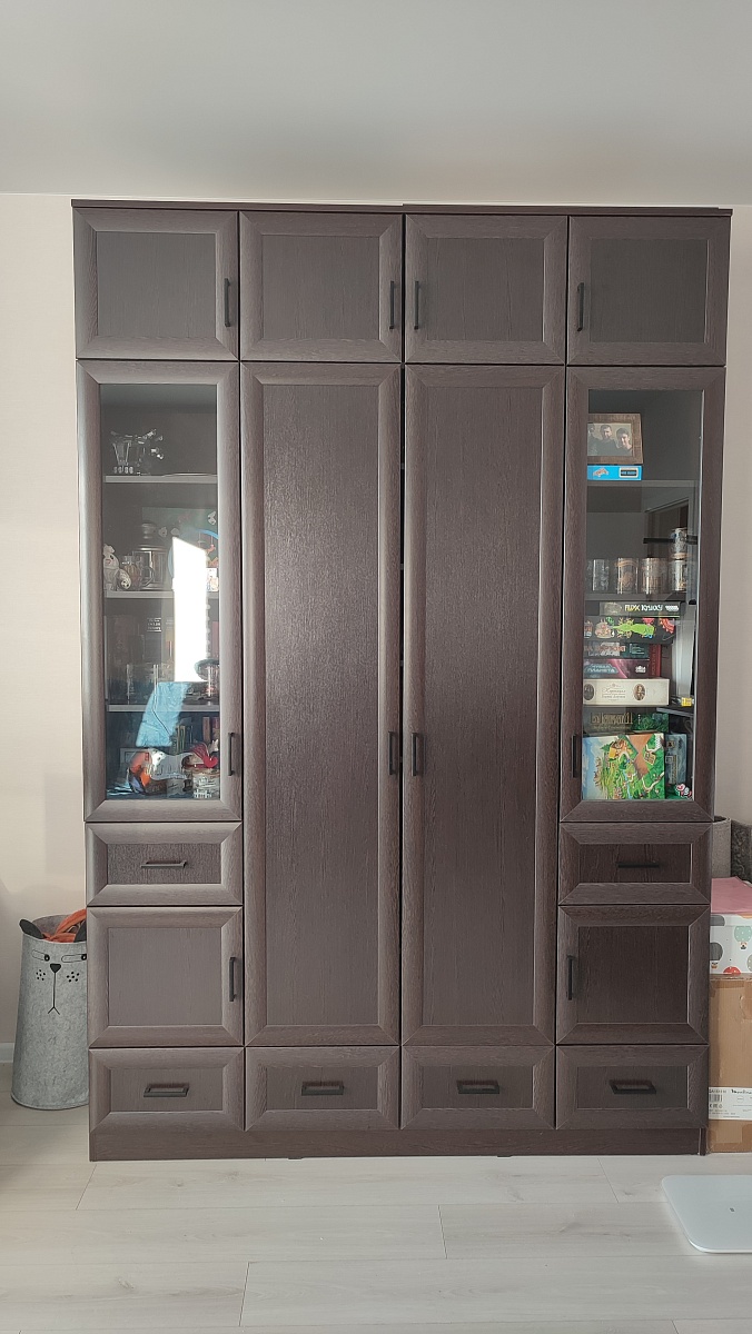 Отличный шкаф. Сделан качественно. Благодаря подобранным размерам получился очень вместительным. Изготовление и доставка заняли всего неделю. Был брак детали одного из ящиков. Лицевая стенка, к которой крепится фасад, имела кромку с нижней, не лицевой стороны (со стороны дня), а верхняя, которую видно при открытии ящика была без кромки. После обращения в поддержку, в течение двух дней привезли новую деталь.