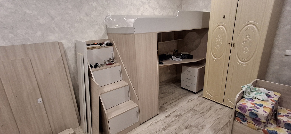 Всё вроде прекрасно, собралось отлично, хоть и не хватает разделения по блокам некоторых элементов для сборки. Все отверстия сошлись, лишних не было. За то положили лишнию полочку. Не хватила чуток крупных болтов для сборки, благо от старой мебели остались. Мне кажется, что щит под матрас и стенку с окошком надо бы делать по толще в стандарте.и добовлять какие нибудь уголки которые дополнитель поддерживали бы щит с матрасом в районе рабочего места, но это наверное перестраховка. А так зачет, мне всё понравилось.