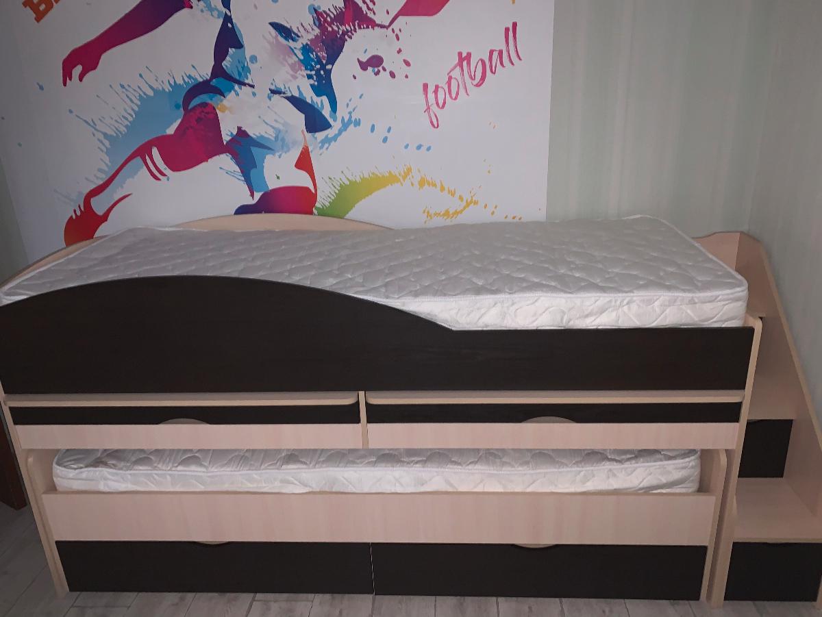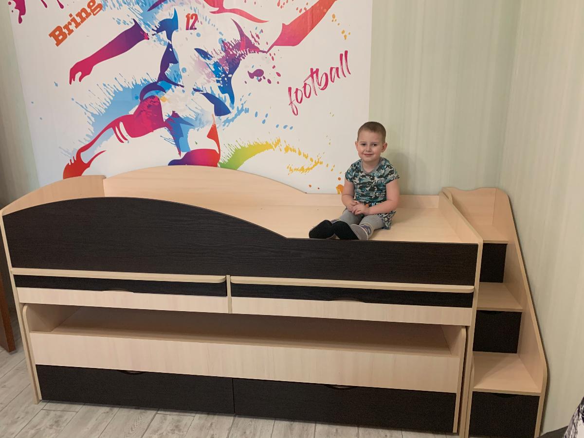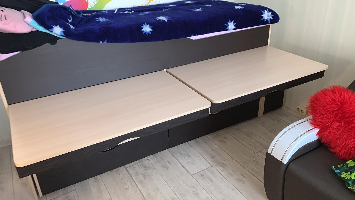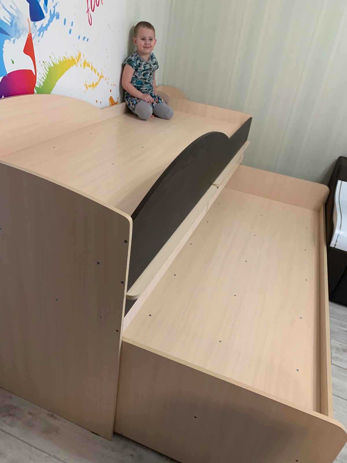 Отличная двухъярусная невысокая кровать, прям как я и хотела. Детям 5,5 и 4 года, как раз то что нам нужно!!! Сделана очень качественно, мы с мужем в восторге! Заказали ещё направляющие с подшипниками, не пожалели ни разу, такой массив обычные выдвижные колесики не выдержат, поэтому лучше немного доплатить и кровать прослужит долгое и долгое время! Спасибо большое магазину ❤️ Рекомендуем от души! Дополнительным плюсом считаю выдвигающиеся два рабочих места. Огромная экономия пространства 👍🏻👍🏻👍🏻