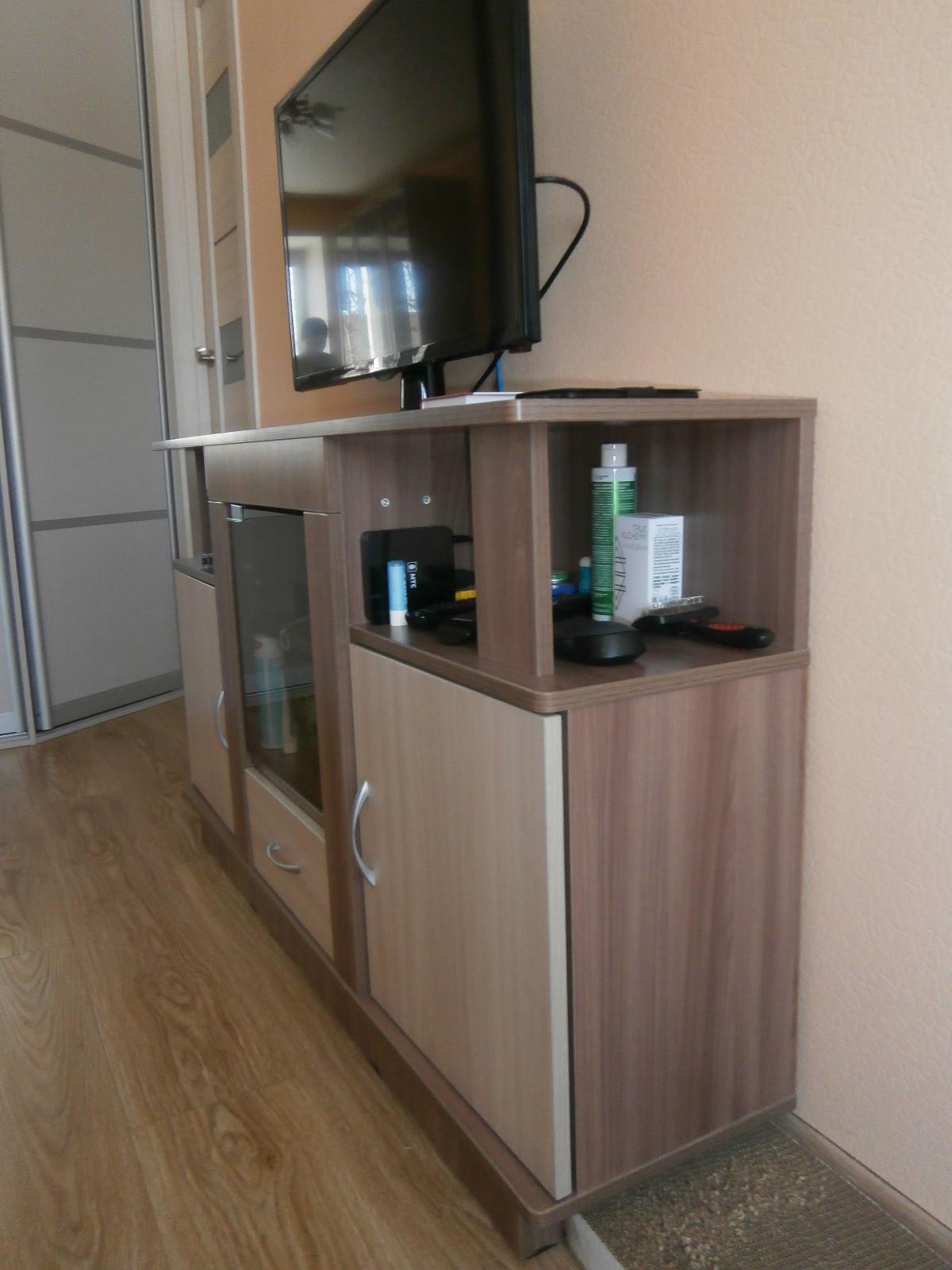 Заказ 00000564751, изделие Тумба под телевизор Виста-11 BMS (1300х750х300)Было необходимо подобрать тумбу под TV по ранее выбранной цветовой гамме мебели и размерам. Оформили заказ в BestMebelShop: тумба под телевизор Виста-11 BMS , габариты 1300х750х300 мм. Это наша вторая покупка в этом интернет-магазине за полгода. Изготовили за 3 дня, доставили в согласованное время — в 23.30. До оплаты курьеру наличными была возможность проверить качество и комплектацию изделия — все ОК. Схема сборки (простенькая) имеется, проблем с самостоятельной сборкой не было. При оформлении заказа выбрали дополнительные опции: ПХВ кромка 2*19 мм, петли с доводчиком, ручки Боярд сатин (металл).Стоимость заказа 9550 руб., с учетом имеющихся у нас бонусов за первую покупку всего к оплате с доставкой вышло 8287 руб. Аналогичные изделия есть в магазинах под заказ, сроки изготовления от 14 до 45 дней, 50% предоплата. Покупкой довольны. На фото две стеклянные дверцы заменены на одно (стекло бронза 360х370 мм) — так удобнее.