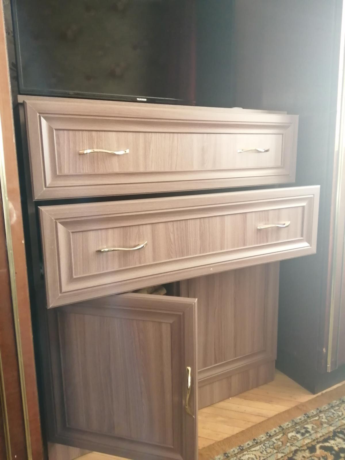 Искали тумбу под тв на кухню. Было много требований: чтобы подошла по размеру в длину и ширину и хотелось конкретную высоту для удобства просмотра тв, чтобы подходила к кухонному гарнитуру, чтобы было много полок для колонок и сабвуфера, а также закрытый шкафчик для всяких инструкций и др.мелочей без ручек. Ничего подобного в готовом виде не нашли, или было слишком дорого. Узнали, что сделать на заказ в нужном размере, цвете и материале - выходит не заоблачная цена. Рискнули заказать и не прогадали. Сработали быстро и качественно. Остались довольны, пользуемся, очень удобно. Пока никаких нареканий к качеству. И даже кот облюбовал себе полочку и прекрасно проводит там время.