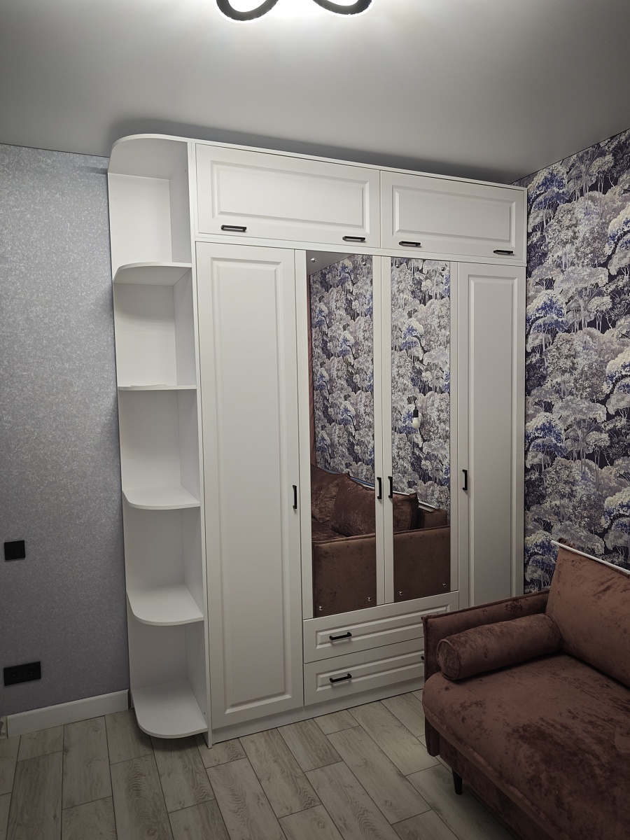 Шкаф заказывала по индивидуальным размерам. Очень удобно, что можно изменить практически все под свой вкус. В данном случае выбрала цвет фасадов и фрезеровку, которая мне была нужна, корпус заменила на эггеровский, петли выбрала с доводчиками хеттиш, на сайте нашла антресь которая открывается вверх, тоже доработала дизайн под шкаф и все дополнила  угловым элементом. Получилось, на мой взгляд отлично. Если ещё сравнивать с ценами на такой же шкаф в салонах мебели, то этот просто бомба по такой цене получился. Со сборкой тоже все без проблем, позвонили по телефону на сайте, договорились о времени. Сборщик профессионал своего дела, ему огромное спасибо. Единственный минус, почему то зеркала изготовили с отверстиями под держатели, а не наклеили их на фасад. Да ещё и держатели не положили. Пришлось срочно ехать покупать их, не хотели заморачиваться с рекламациями, ждать довоза или замены.